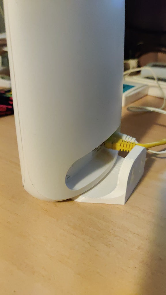 Απλή επιτοίχια βάση για την ακόλουθη Netgear Orbi AX1800, κρυμμένη κάτω από το δρομολογητή.
