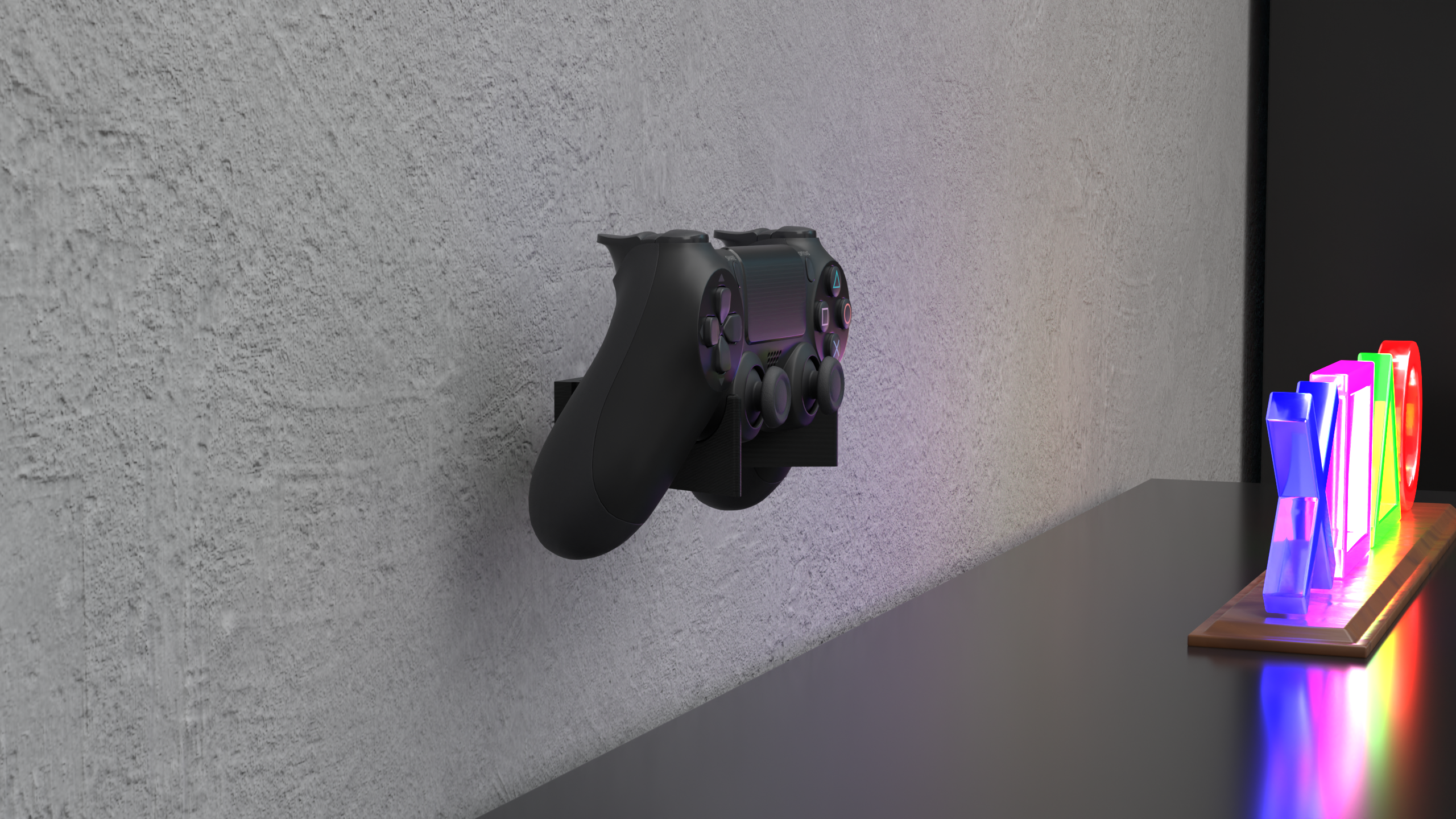 Λεπτή βάση στήριξης τοίχου για έναν ελεγκτή PS4, με χώρο για το καλώδιο φόρτισης ενώ ο ελεγκτής βρίσκεται στη βάση.