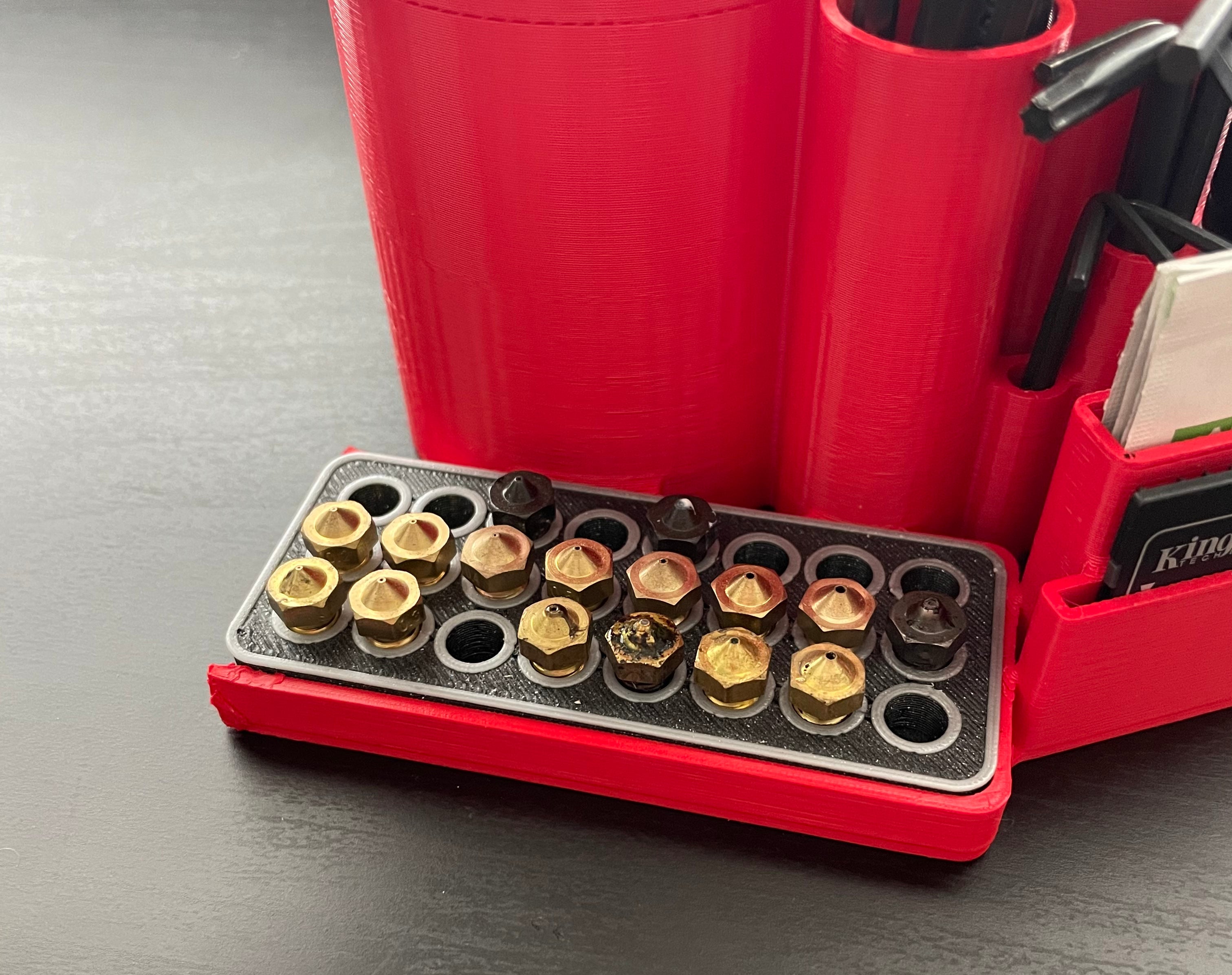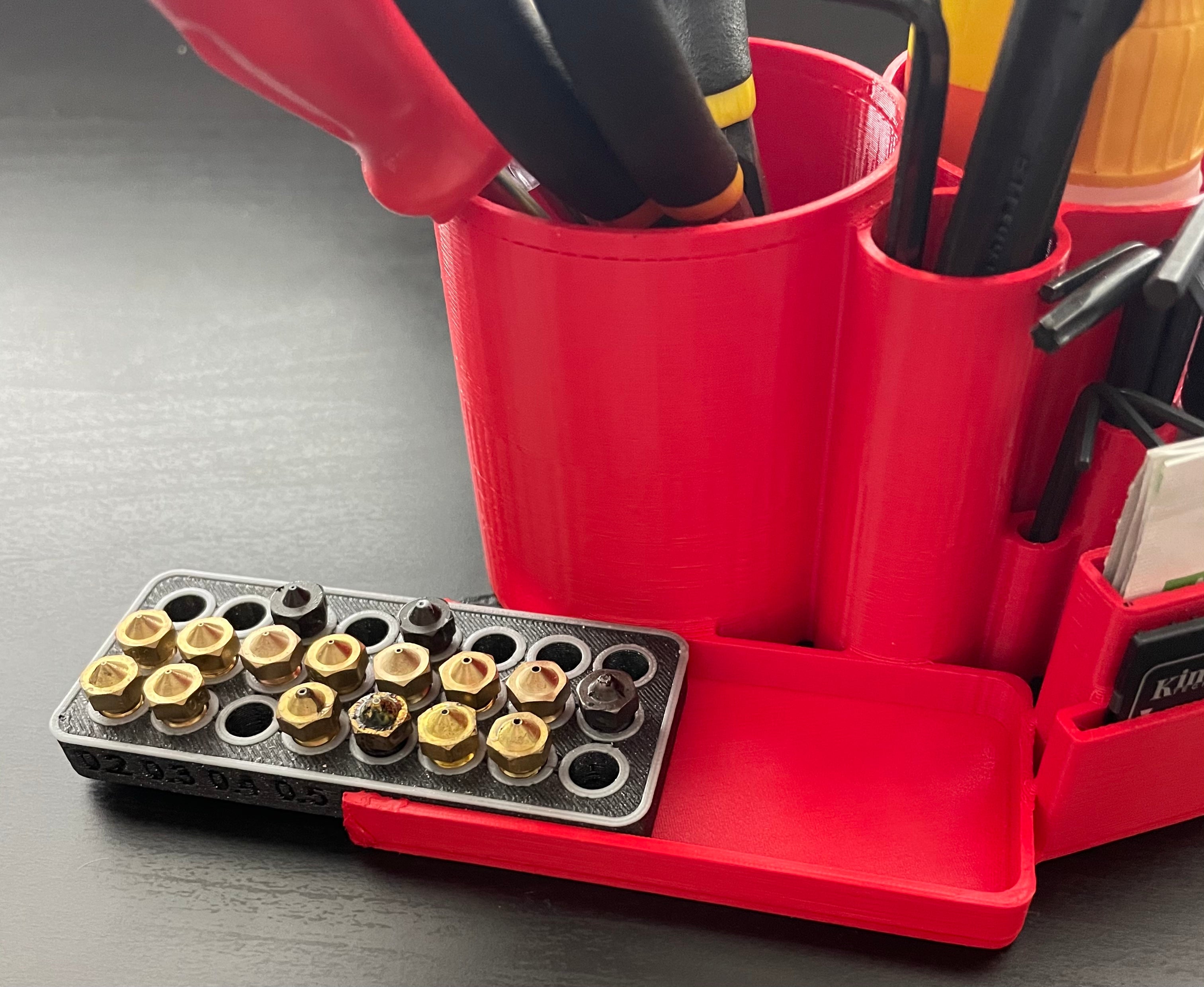 Μια θήκη εργαλείων και μια συσκευή οργάνωσης που σχεδίασα για να αποθηκεύω όλα μου τα εργαλεία. Χωράει άνετα δίπλα στον εκτυπωτή. Είναι συμβατό με αυτή τη θήκη ακροφυσίων: https://www.prusaprinters.org/prints/57441-nozzle-organizer. Εργαλεία όπως ακροφύσια, βούρτσες, κόλλα, πένσες, κατσαβίδια, κλειδιά Allen, κάρτες microSD, κάρτες SD και πανιά μπορούν να αποθηκευτούν σε αυτή τη θήκη. Παρέχει εύκολη και τακτοποιημένη αποθήκευση και πρόσβαση στα απαραίτητα εργαλεία σας.
