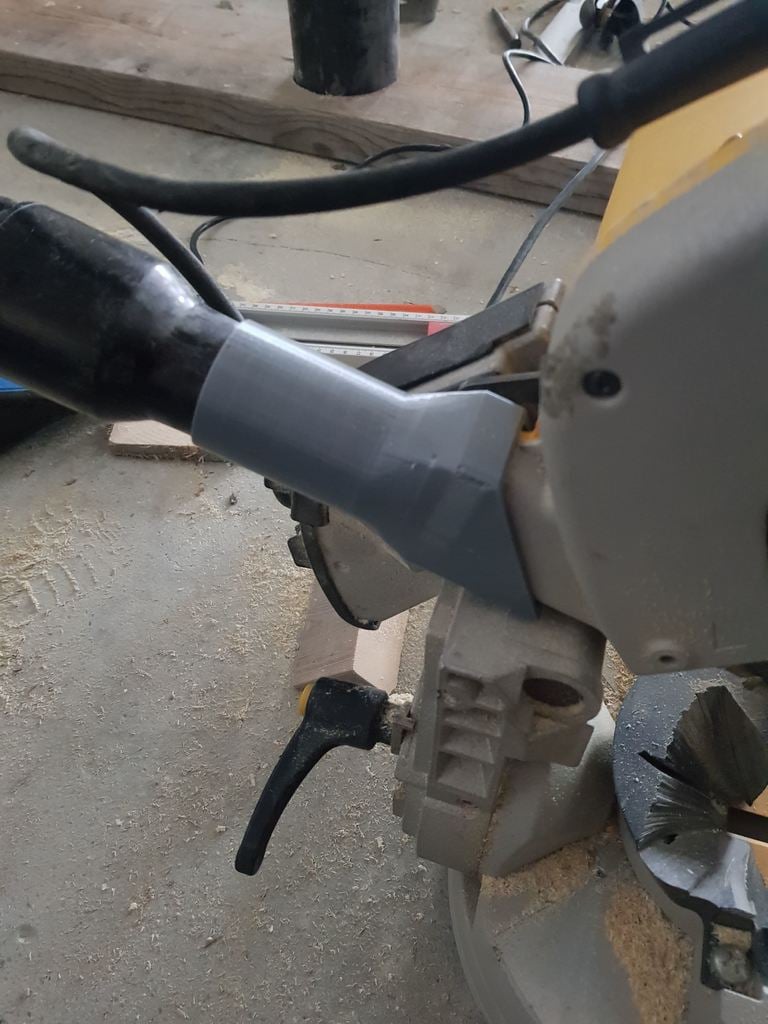 Αυτός είναι ένας τρισδιάστατος τυπωμένος προσαρμογέας για να συνδέσετε τον εύκαμπτο σωλήνα της ηλεκτρικής σκούπας στο πριόνι γωνίας Dewalt 707. Η σύνδεση στον εύκαμπτο σωλήνα της ηλεκτρικής σκούπας βασίζεται σε έναν κωνικό σωλήνα με διάμετρο 34 έως 36 mm σε μήκος 50 mm.
