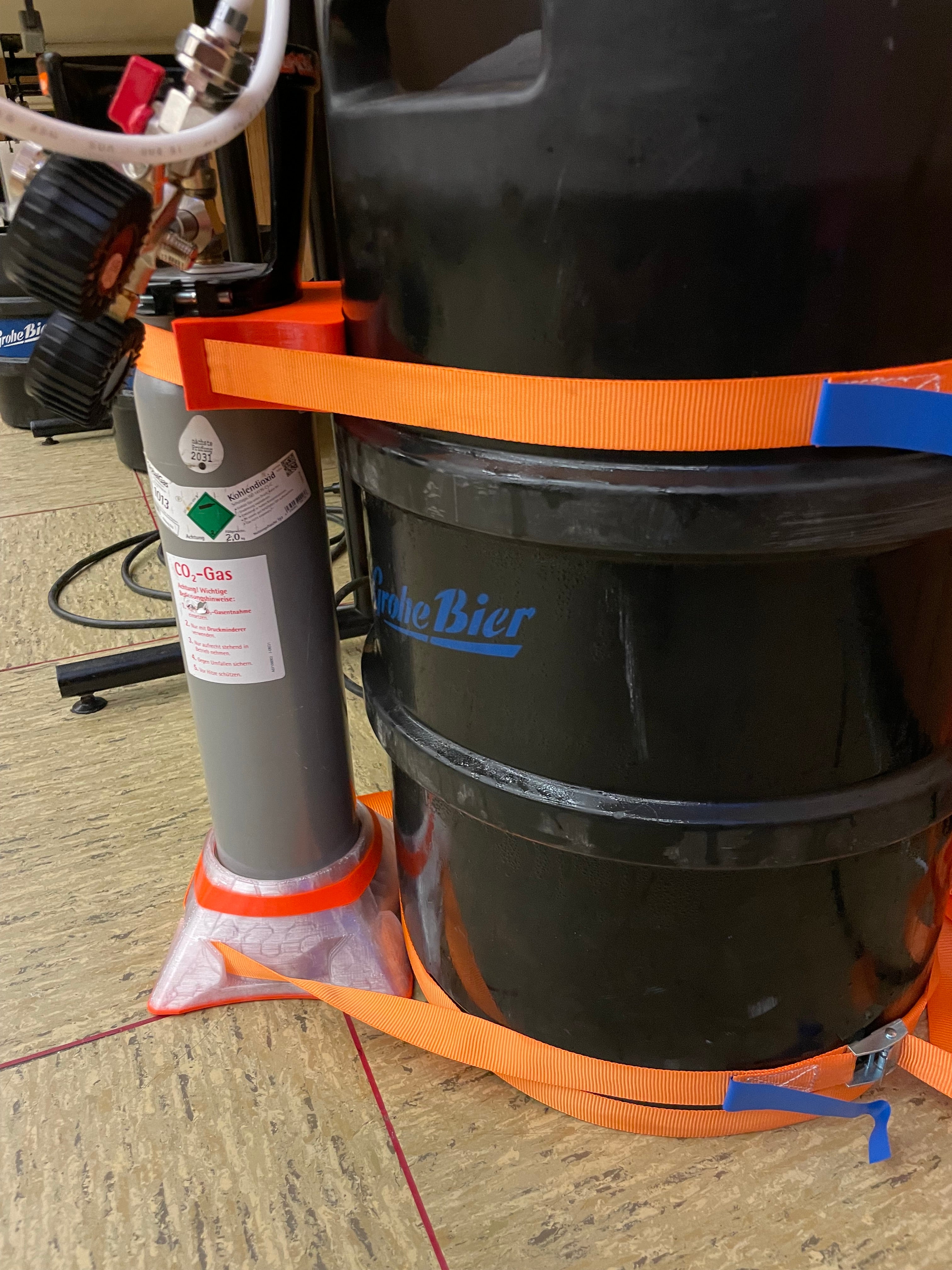 Έχει αναπτυχθεί ειδικά για φιάλες CO2 2 λίτρων και ταιριάζει τέλεια τόσο σε βαρέλια μπύρας 30 λίτρων όσο και 50 λίτρων. Με διάμετρο ανοίγματος περίπου 10,5 cm, επιτυγχάνεται μια άνετη και σταθερή εφαρμογή. Για πρόσθετη ασφάλεια, η φιάλη μπορεί εύκολα να στερεωθεί με ιμάντες πλάτους έως 25 mm, εξαλείφοντας τον κίνδυνο ανατροπής.