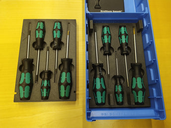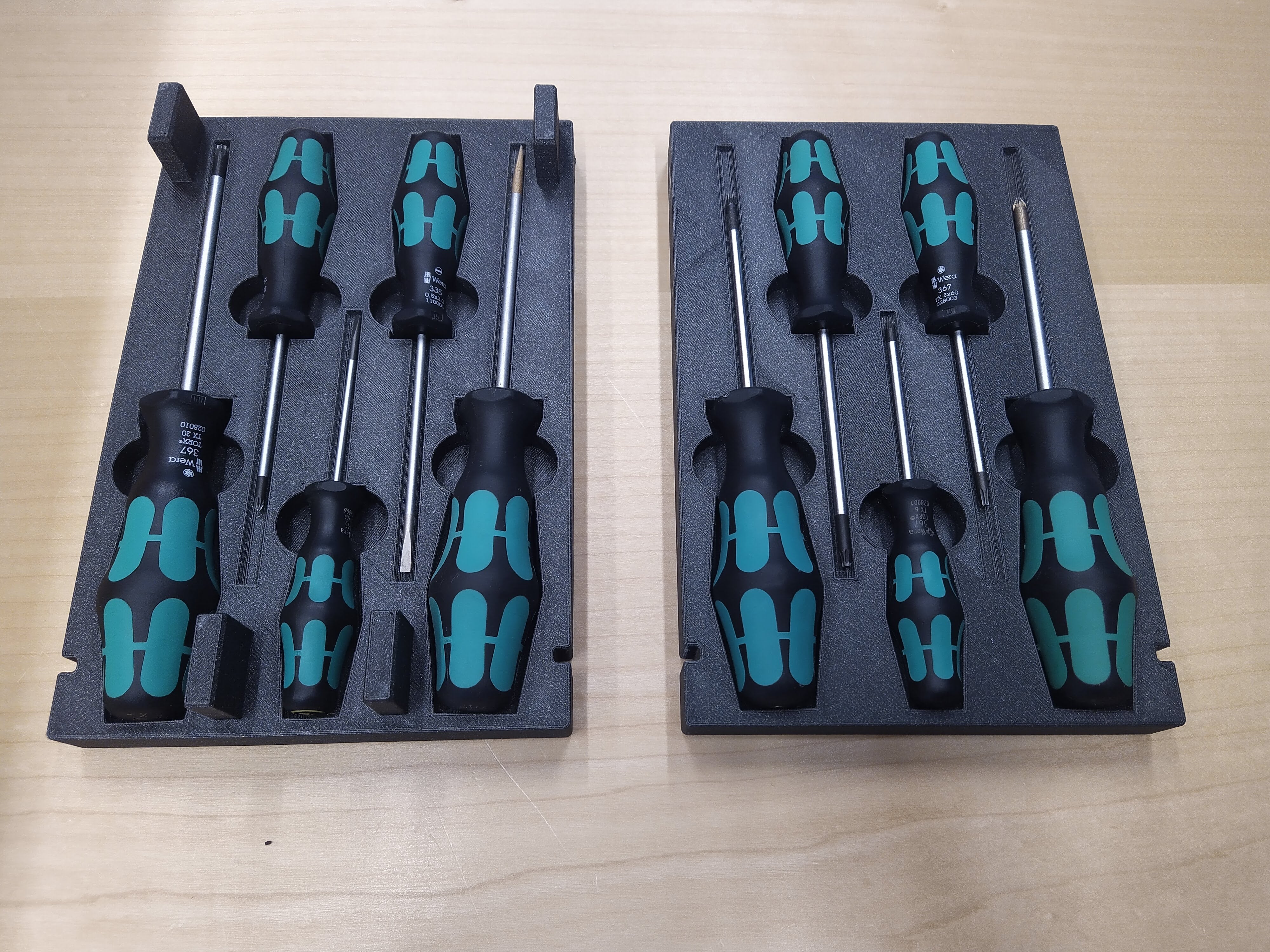 Αυτός ο στοιβαζόμενος δίσκος έχει σχεδιαστεί για να οργανώνει αποτελεσματικά τα κατσαβίδια σας. Είναι ειδικά προσαρμοσμένο για να φιλοξενεί τα τρία κύρια μεγέθη λαβών WERA και μήκους λεπίδας. Κάθε δίσκος μπορεί να αποθηκεύσει 2 μεγάλα (λεπίδα 100 mm, λαβή 98 mm), 2 μεσαία (λεπίδα 80 mm, λαβή 81 mm) και 1 μικρό κατσαβίδι (λεπίδα 60 mm, λαβή 70 mm).