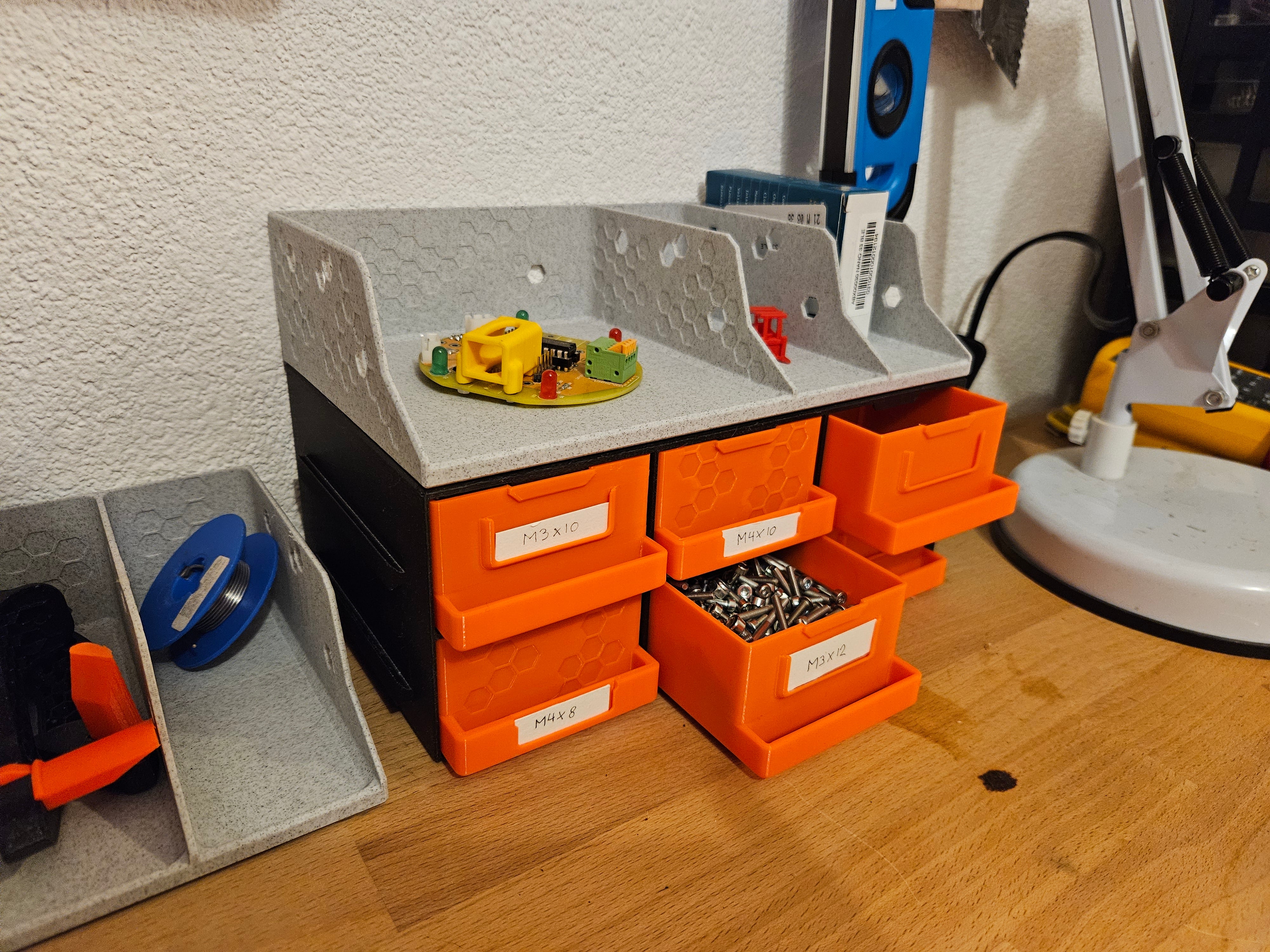 Αυτό το αρθρωτό συρταριέρα έχει σχεδιαστεί για να φέρει τάξη και αποτελεσματικότητα στο εργαστήριό σας, στο δωμάτιο χόμπι ή σε οποιονδήποτε άλλο χώρο όπου μικρά μέρη και εργαλεία πρέπει να είναι οργανωμένα. Το σύστημα αποτελείται από στοιβαζόμενα ράφια και συρτάρια με εύκαμπτους διαιρέτες χώρου, επιτρέποντάς σας να προσαρμόσετε την αποθήκευση ακριβώς στις ανάγκες σας. Είτε χρειάζεται να αποθηκεύσετε βίδες, ηλεκτρονικά εξαρτήματα, υλικά χειροτεχνίας ή ακόμα και ένα ηλεκτρικό κατσαβίδι και τα εξαρτήματά του, αυτό το ντουλάπι προσφέρει μια πρακτική λύση. Τα συρτάρια είναι εξοπλισμένα με ένα έξυπνο αντιολισθητικό σύστημα που τα εμποδίζει να πέσουν έξω όταν μετακινείτε τα ράφια. Για μεγαλύτερη ευκολία, μπορείτε να χρησιμοποιήσετε τα ενσωματωμένα πεδία σήμανσης για ετικέτες χαρτιού ή τρισδιάστατες εκτυπωμένες ετικέτες, ώστε να μπορείτε γρήγορα να αναγνωρίσετε το περιεχόμενο. Με διαφορετικές διαμορφώσεις ραφιών, συμπεριλαμβανομένων των συρταριών 3x4, 3x3 και 3x2, μπορείτε να δημιουργήσετε μια προσαρμοσμένη λύση αποθήκευσης που μεγιστοποιεί τη χρήση του χώρου σας. Αυτή είναι μια ιδανική λύση οργάνωσης για όσους αναζητούν ένα δομημένο περιβάλλον όπου όλα έχουν τη θέση τους.