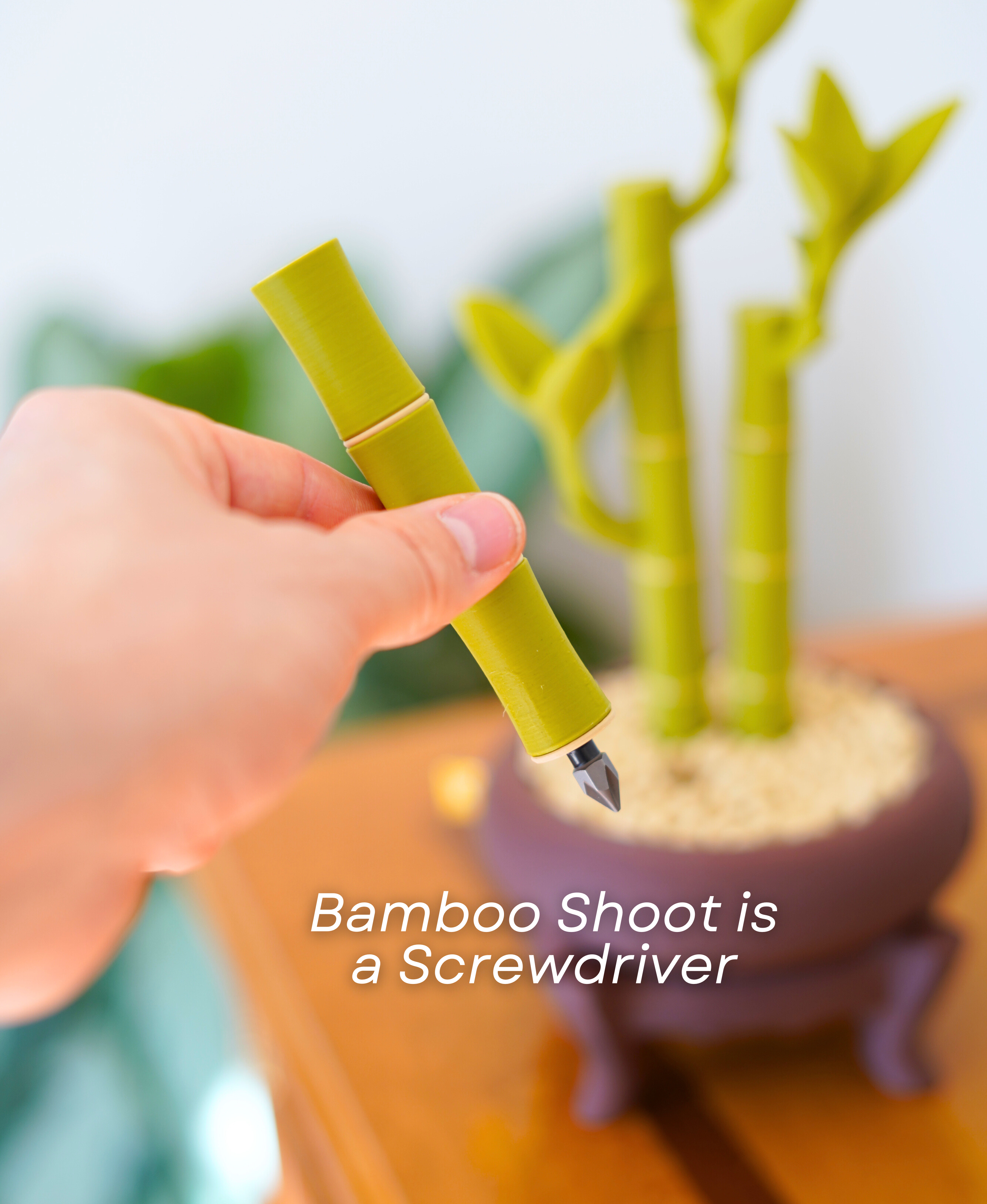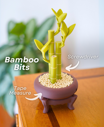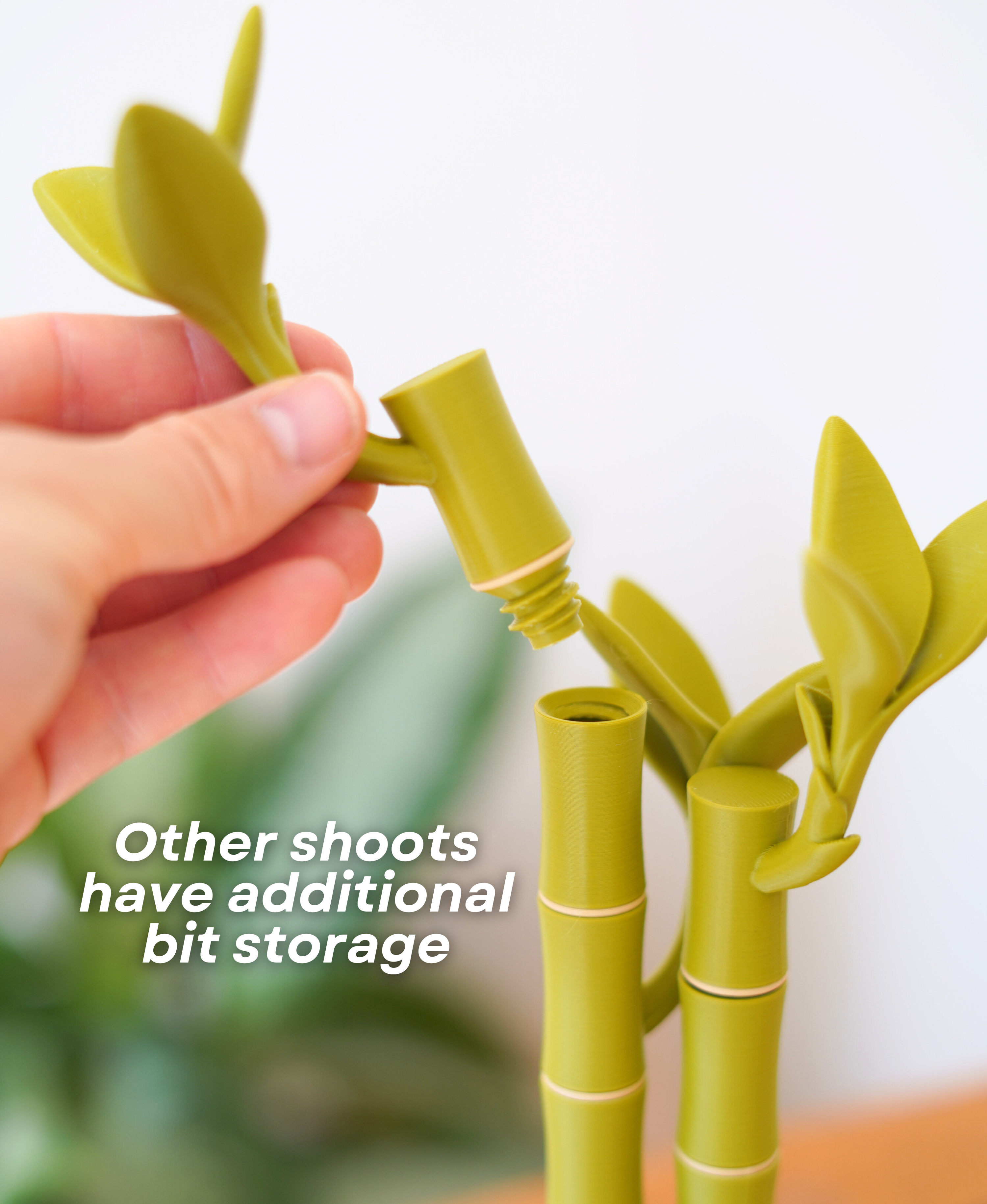 Για να συμπληρώσουν τις κύριες λειτουργίες, τα Bamboo Bits προσφέρουν επιπλέον αποθήκευση εργαλείων σε δύο επιπλέον βλαστούς μπαμπού. Αυτά είναι ιδανικά για τη διατήρηση οργανωμένων εξειδικευμένων εξαρτημάτων, όπως εξαρτήματα αστεριού ή τετράγωνου σχήματος, ώστε να είστε προετοιμασμένοι για κάθε εργασία. Με τον στοχαστικό μπαμπού-εμπνευσμένο σχεδιασμό του, το Bamboo Bits δεν είναι απλώς μια πρακτική λύση, αλλά και ένα διακοσμητικό στοιχείο που ενώνει την τάξη με την ομορφιά της φύσης.
