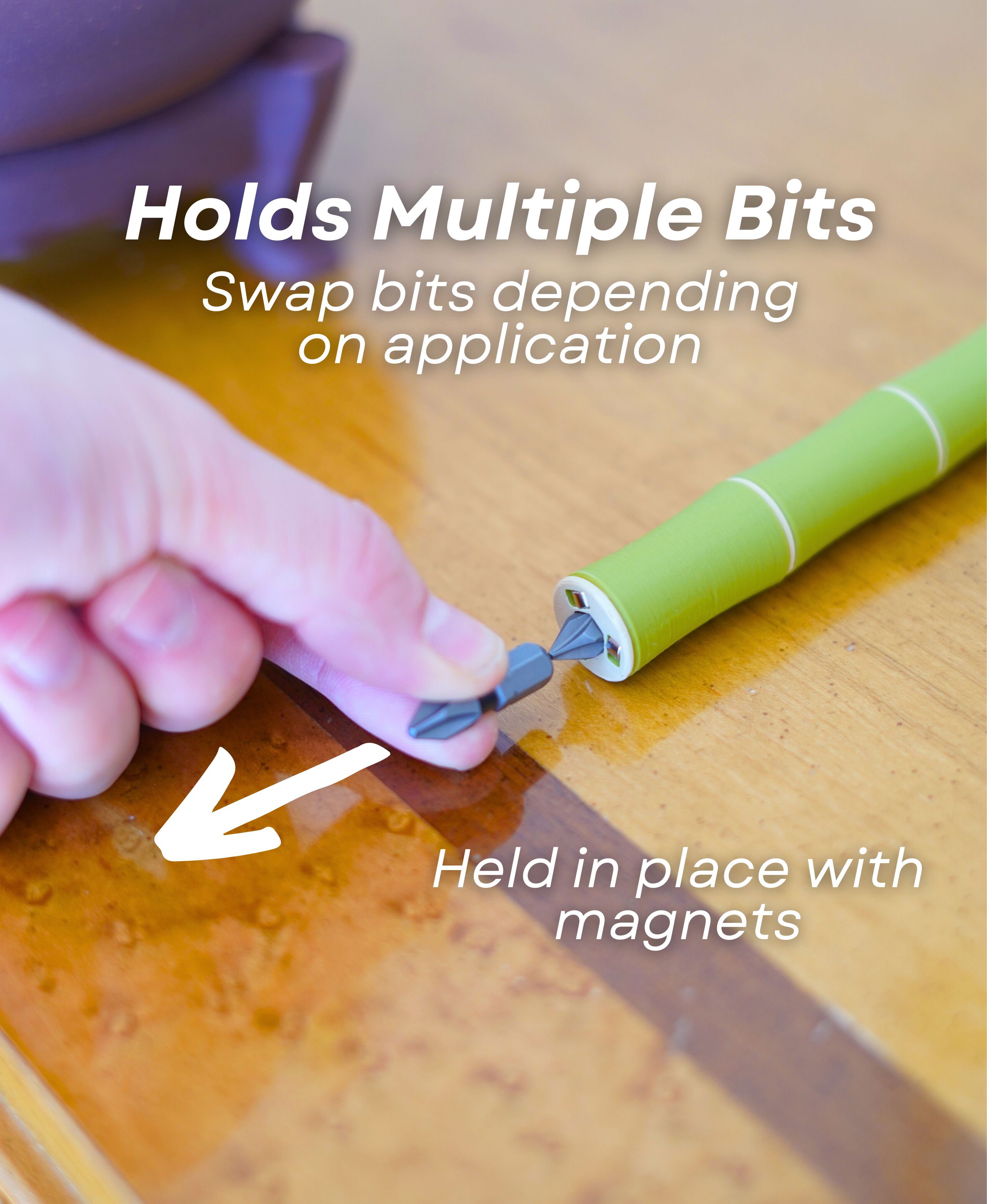 Ο πυρήνας του συστήματος Bamboo Bits είναι ένα κατσαβίδι, το οποίο είναι κομψά ενσωματωμένο σε έναν από τους βλαστούς μπαμπού. Αυτό το λειτουργικό κατσαβίδι είναι εξοπλισμένο με μαγνητικές υποδοχές που παρέχουν χώρο για την αποθήκευση έως και τεσσάρων διαφορετικών εξαρτημάτων προγράμματος οδήγησης. Αυτό διασφαλίζει ότι μπορείτε πάντα να αλλάζετε γρήγορα μεταξύ διαφορετικών τύπων εξαρτημάτων, όπως κατσαβίδια σταυρού και ίσιας κεφαλής, και να έχετε το σωστό εργαλείο στα χέρια σας.