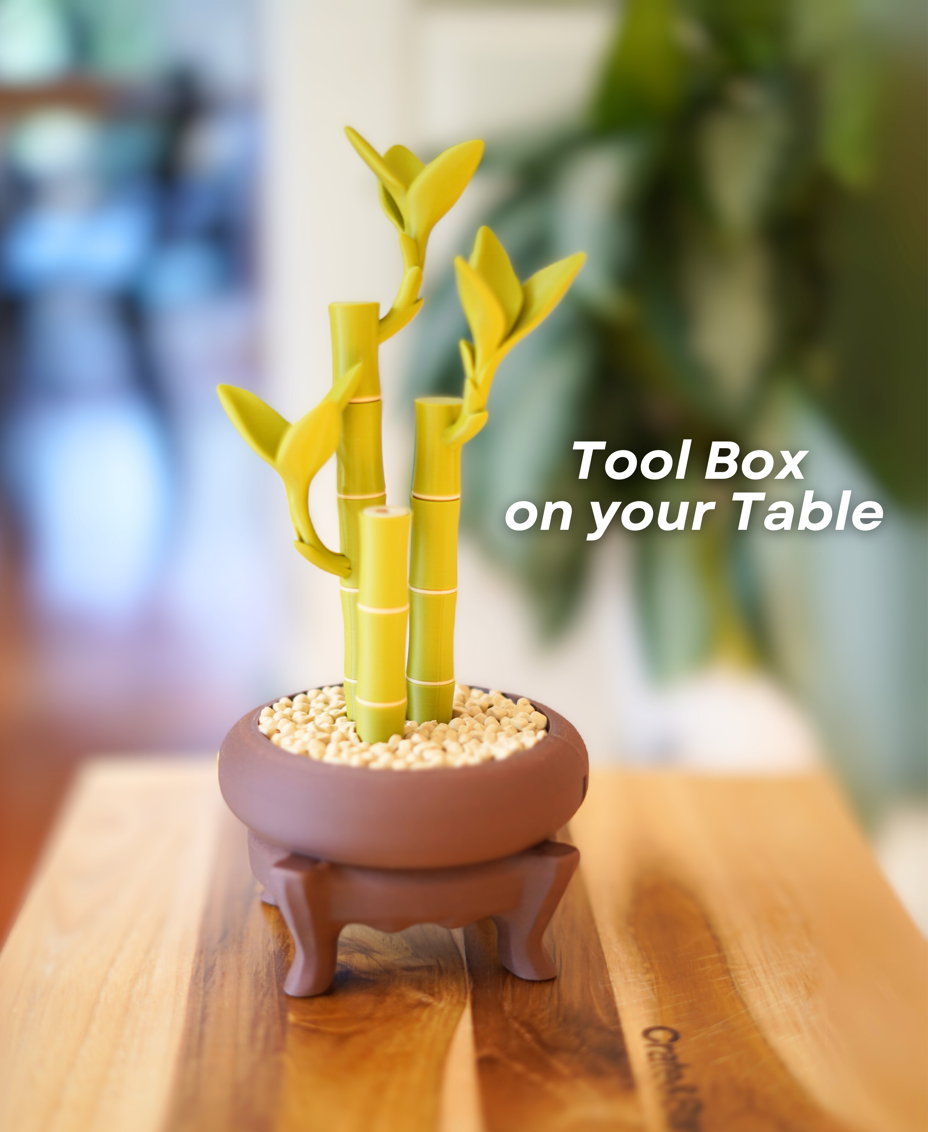 Ανακαλύψτε έναν αρμονικό συνδυασμό λειτουργικότητας και αισθητικής με το Bamboo Bits, ένα καινοτόμο σύστημα αποθήκευσης εργαλείων που έχει σχεδιαστεί για να διατηρεί τα βασικά σας εργαλεία οργανωμένα και σε κοντινή απόσταση, ενώ παράλληλα προσθέτει μια φυσική πινελιά στην διακόσμηση του σπιτιού σας. Αυτή η έξυπνη λύση είναι ιδανική για κάθε γραφείο, χώρο εργασίας ή γωνιά χόμπι, όπου θέλετε να διατηρήσετε μια τακτοποιημένη και κομψή έκφραση.