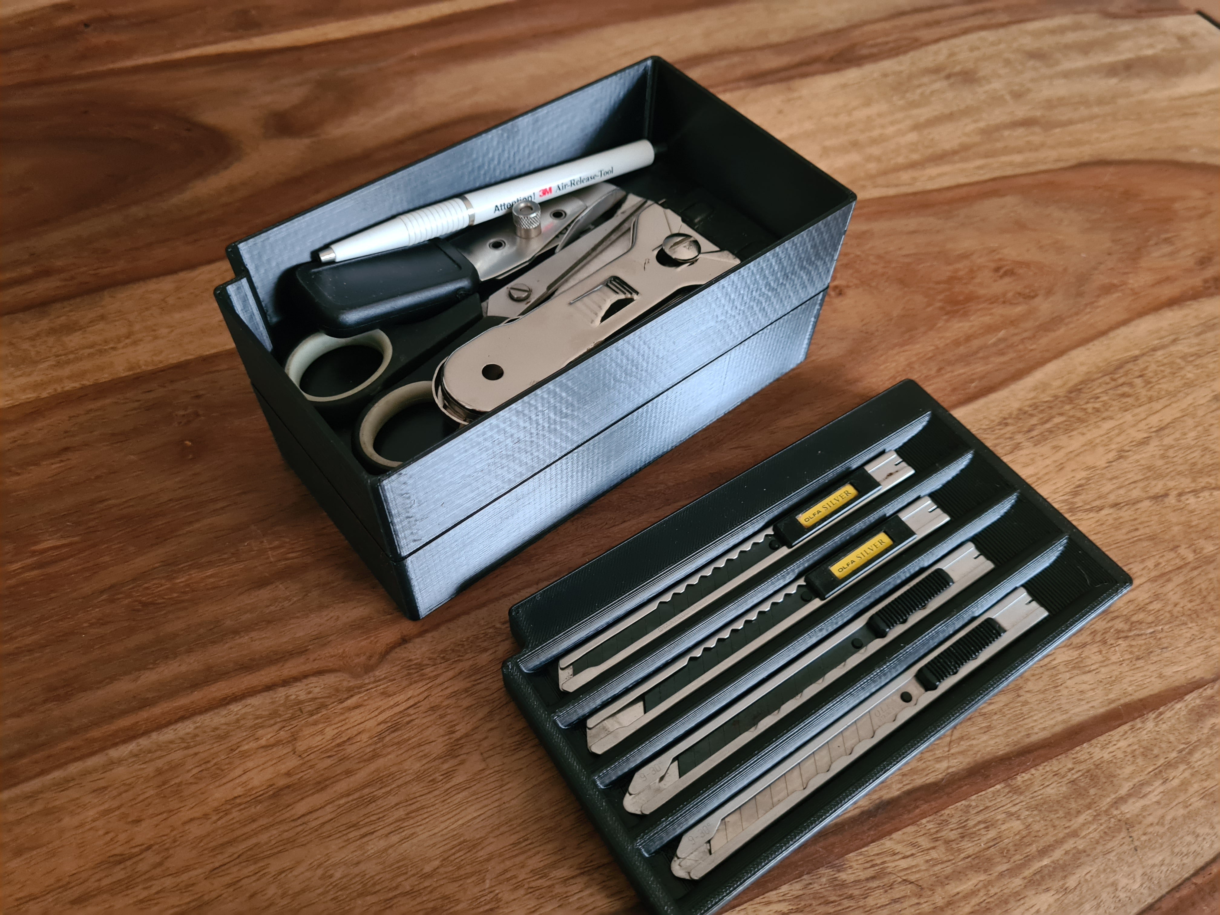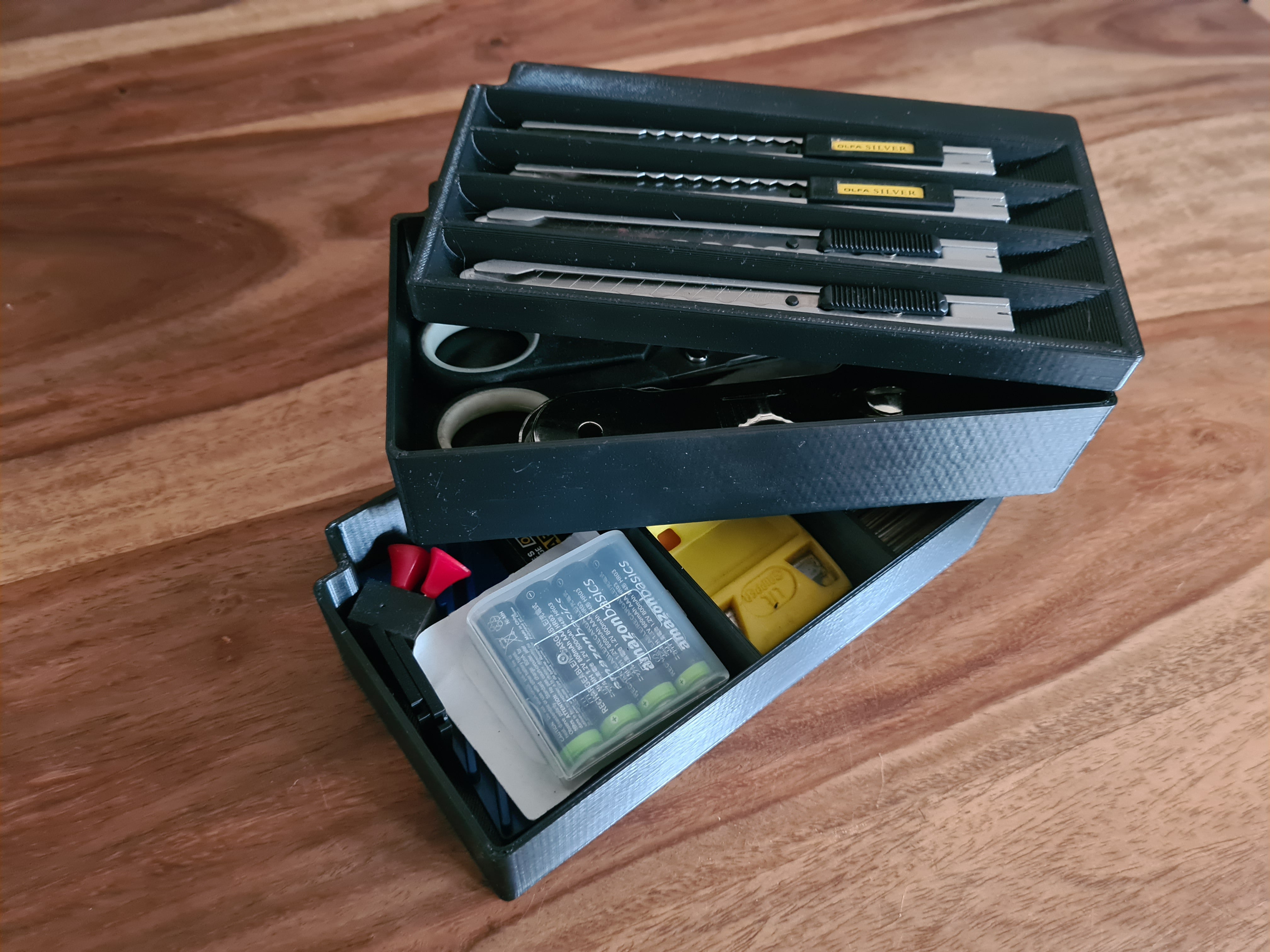 Το κουτί χωρίζεται σε πρακτικούς χώρους, ένας από τους οποίους είναι αφιερωμένος στο κοπίδι σας για γρήγορη και ασφαλή πρόσβαση. Επιπλέον, περιέχει δύο επιπλέον αποθηκευτικούς χώρους που είναι ιδανικοί για την οργάνωση ανταλλακτικών φορτίων, λεπίδων ξυραφιού, μικρών μπαταριών ή άλλων παρόμοιων αναλώσιμων. Τα κάτω αρθρωτά κουτιά μπορούν να φιλοξενήσουν επιπλέον εξειδικευμένα εργαλεία, συμβάλλοντας σε έναν τακτοποιημένο και αποτελεσματικό χώρο εργασίας.