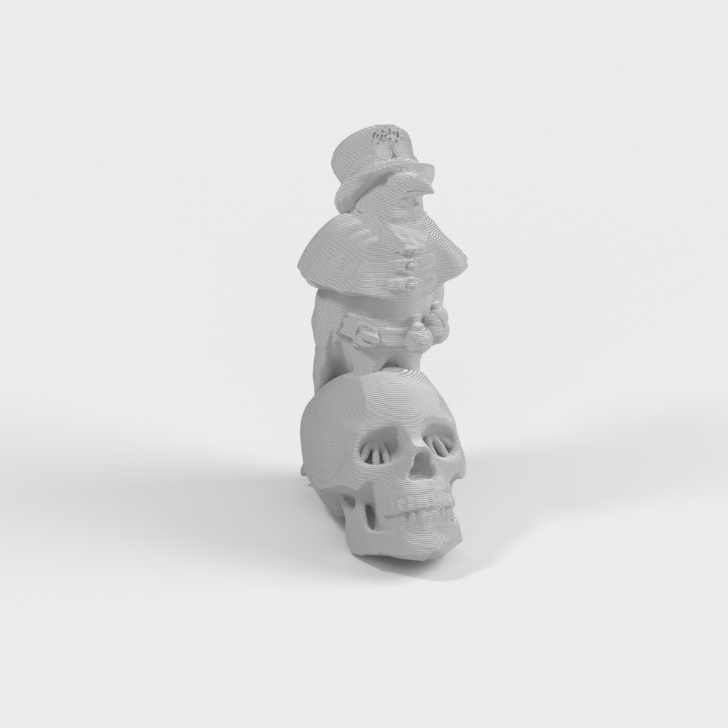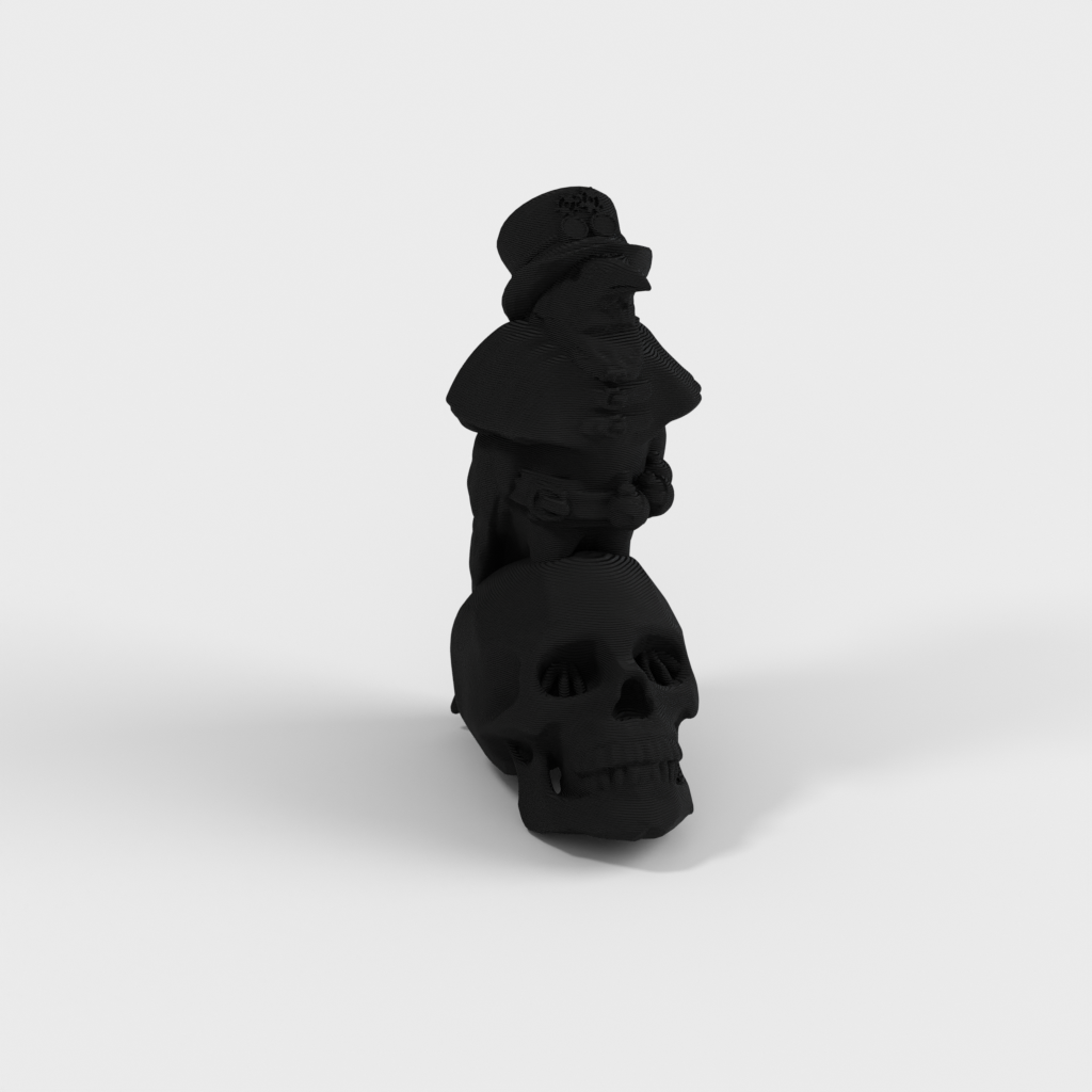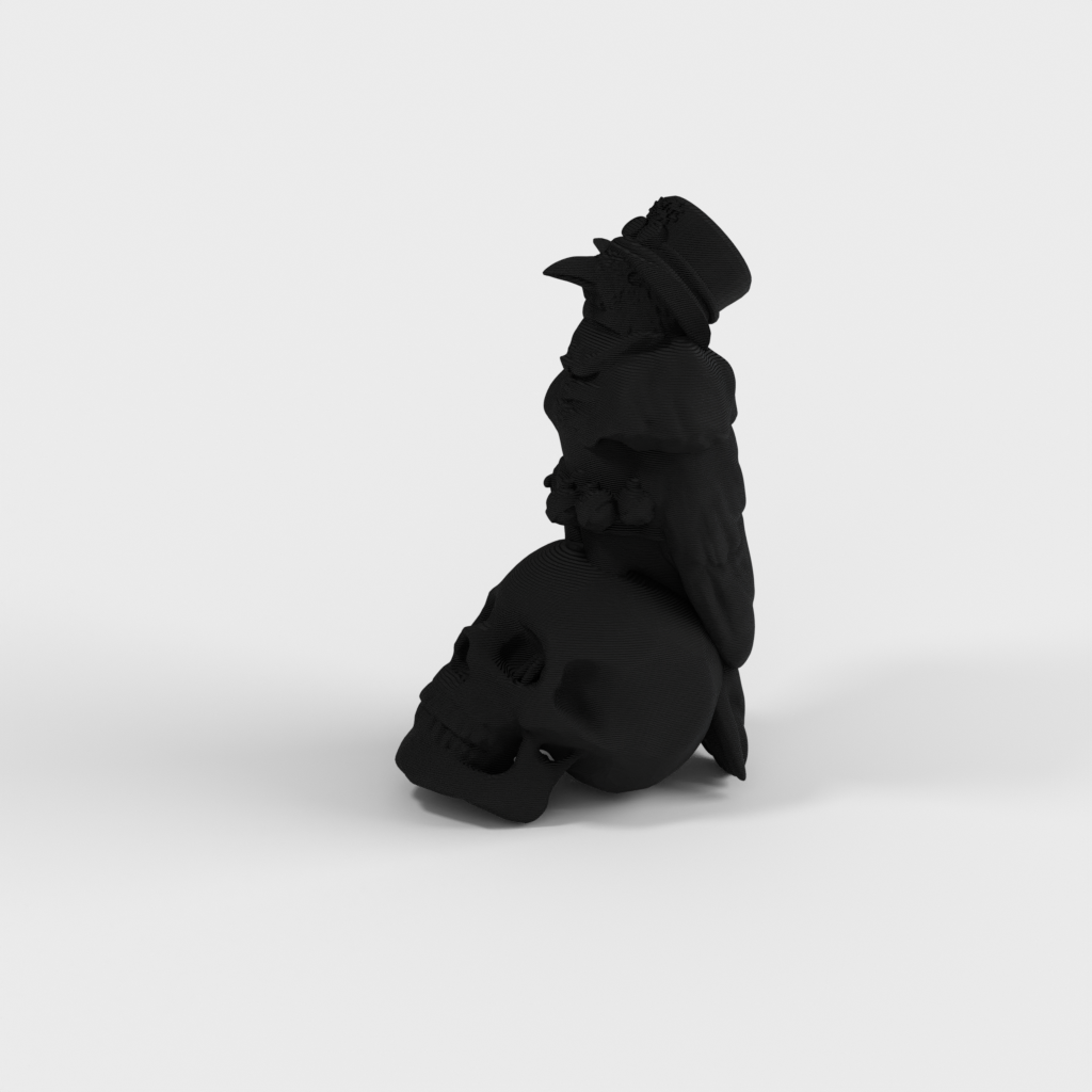 Αυτή η μοναδική φιγούρα δείχνει ένα εντυπωσιακό κοράκι ντυμένο με λεπτομερή ρούχα εμπνευσμένα από το steampunk. Τα φτερά του πουλιού είναι επιδέξια σχεδιασμένα ώστε να μοιάζουν με γρανάζια και μηχανισμούς ρολογιού, ενώ το μεταλλικό καπέλο και τα γυαλιά του προσθέτουν μια πινελιά βιομηχανικής πολυπλοκότητας. Το κοράκι κάθεται μεγαλοπρεπώς σε ένα ανθρώπινο κρανίο, το οποίο έχει σχεδιαστεί με λεπτές λεπτομέρειες που ενισχύουν τη γοτθική και μυστηριώδη έκφραση.