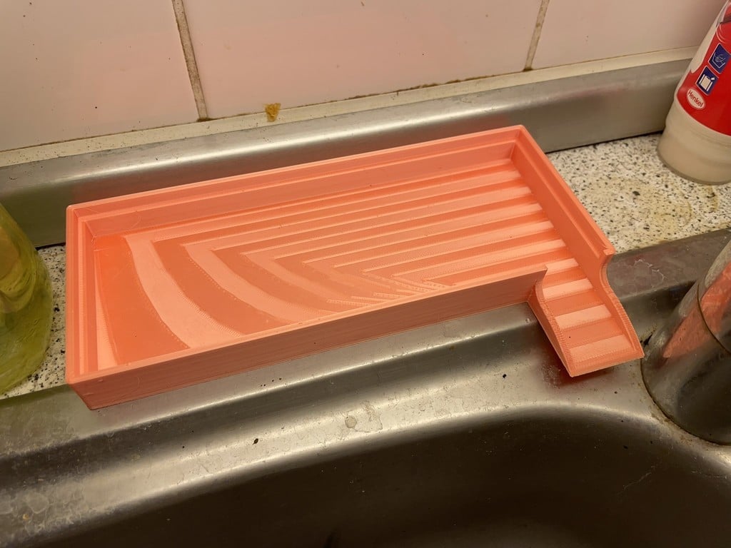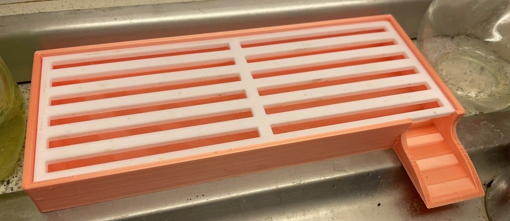 Οι διαστάσεις του οργανωτή είναι καλά μελετημένες για να χωράνε στους περισσότερους τυπικούς νεροχύτες κουζίνας. Η βάση έχει διαστάσεις 8 cm x 20 cm x 2 cm και περιλαμβάνει αποχέτευση μήκους 3,5 cm και πλάτους 3 cm. Η ίδια η ρακέτα έχει διαστάσεις 7,4 cm x 19,4 cm και η θήκη μπουκαλιών έχει ύψος 13,8 cm, παρέχοντας άφθονο χώρο ακόμη και για ψηλότερα μπουκάλια.