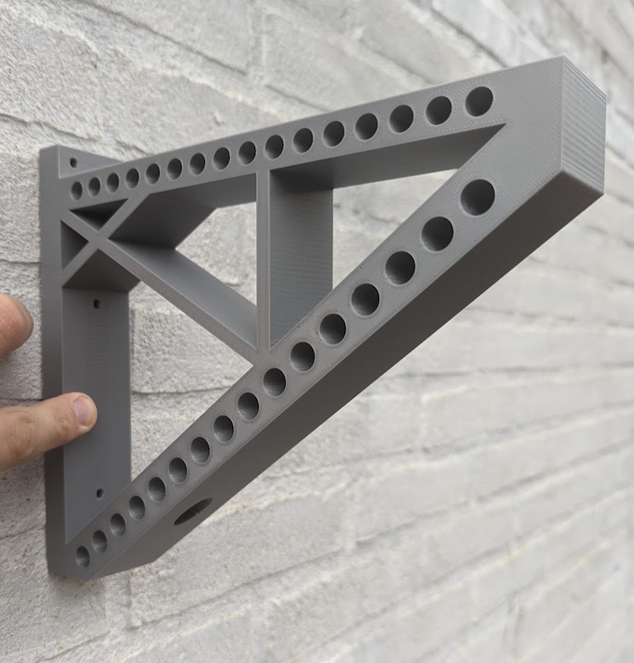 Έχετε επίσης την επιλογή να προσθέσετε τυπωμένα στηρίγματα ραφιών, τα οποία παρέχουν σταθερή υποστήριξη για τα ράφια σας. Αυτό το άγκιστρο τοίχου είναι ιδανικό για τη δημιουργία οργανωμένου χώρου σε οποιοδήποτε δωμάτιο, από το σαλόνι μέχρι το εργαστήριο, και μπορεί να μεταφέρει τα πάντα, από βιβλία και κουτιά αποθήκευσης μέχρι τα αγαπημένα σας στολίδια και διακοσμήσεις. Η πολυλειτουργική κατασκευή με επιπλέον τρύπες δίνει επίσης τη δυνατότητα για μελλοντικές προσαρμογές, για παράδειγμα, στερέωση σχοινιών από την οροφή για την ασφάλιση μακρύτερων αντικειμένων όπως ράβδους ή σανίδες.
