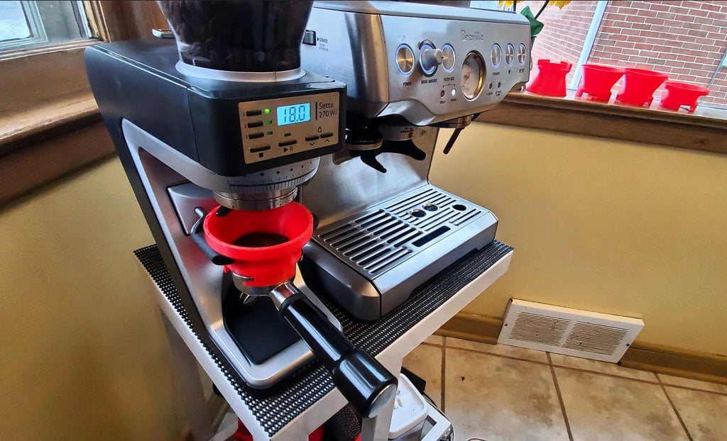 Αυτή η χοάνη δοσομέτρησης έχει αναπτυχθεί για να βελτιώσει τη διαδικασία παρασκευής καφέ σας ελαχιστοποιώντας τα απόβλητα κατά την άλεση. Έχει σχεδιαστεί για να ταιριάζει απόλυτα στο portafilter Breville BES 870 54mm όταν αλέθετε καφέ με έναν μύλο Baratza Sette 270wi. Η χοάνη διασφαλίζει ότι ο αλεσμένος καφές κατευθύνεται απευθείας στο portafilter χωρίς να απλώνεται στο τραπέζι, με αποτέλεσμα μια καθαρότερη επιφάνεια εργασίας και μια πιο αποτελεσματική διανομή καφέ. Ένα πρακτικό εργαλείο για όσους θέλουν να βελτιστοποιήσουν την παρασκευή του espresso τους.