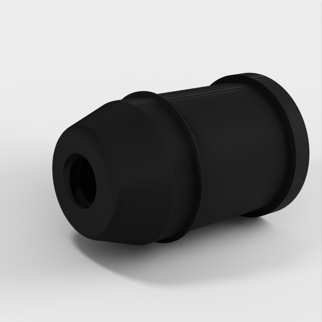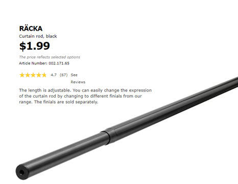 Αυτή είναι η τελική τάπα για το κουρτινόξυλο IKEA Räcka. Το ακραίο βύσμα είναι ένα απλό βύσμα που διαθέτει μια οπή με σπείρωμα για να τοποθετηθεί το κουμπί. Το πώμα έχει μια μικρή ανύψωση κατά μήκος του κυλίνδρου για να το κρατάει στη θέση του. Κάθε ράβδος έχει δύο ράβδους διαμέτρου - μια εσωτερική ράβδος βρίσκεται μέσα στην εξωτερική ράβδο, ώστε να μπορεί να ρυθμιστεί το συνολικό μήκος. Διατίθενται ανταλλακτικά τόσο για την εσωτερική όσο και για την εξωτερική ράβδο.