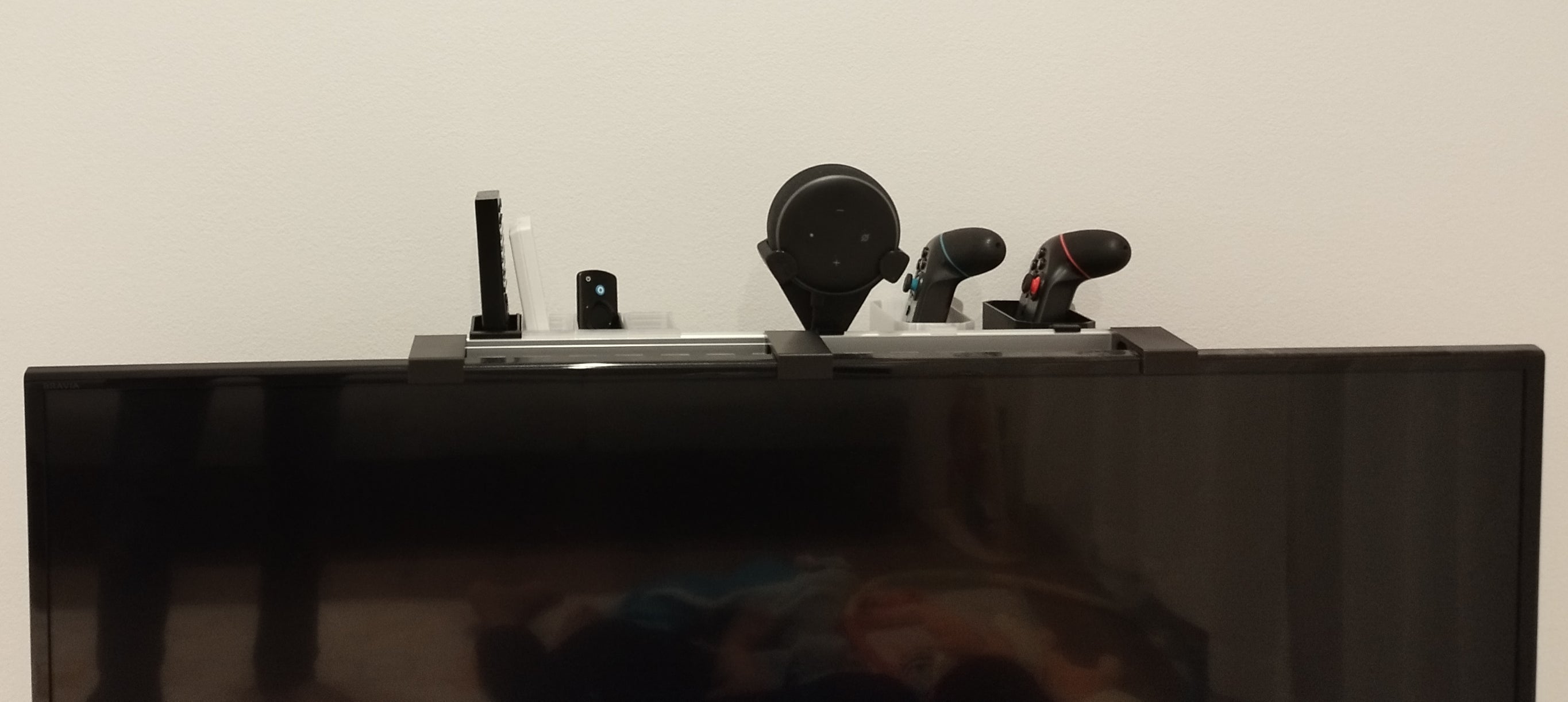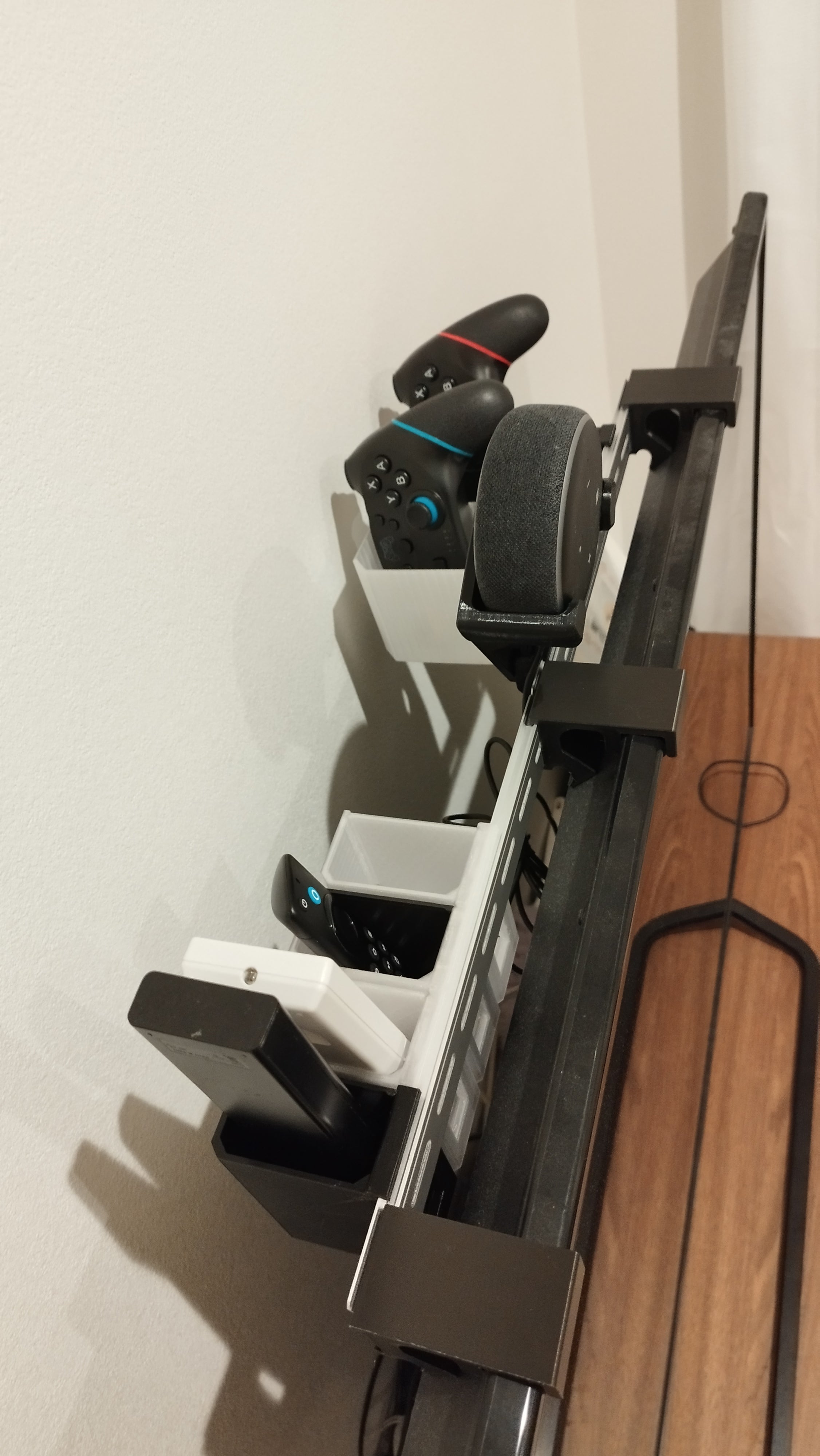Η βάση βασίζεται σε ένα ευέλικτο σύστημα ράγας DIN, το οποίο σας δίνει τη δυνατότητα να προσαρμόσετε την αποθήκευση ακριβώς στις ανάγκες σας. Μπορείτε εύκολα να τοποθετήσετε διαφορετικούς τύπους θηκών στη ράγα για να φιλοξενήσετε τα πάντα, από το τηλεχειριστήριο της τηλεόρασής σας, το τηλεχειριστήριο AC και το Fire TV remote έως ένα Amazon Echo Dot (3ης γενιάς) ή ακόμα και ένα Switch Pro Controller. Ο αρθρωτός σχεδιασμός καθιστά δυνατή την επέκταση της ράγας με περισσότερα τμήματα εάν χρειάζεστε επιπλέον αποθηκευτικό χώρο. Λάβετε υπόψη ότι η τηλεόραση πρέπει να μπορεί να υποστηρίξει το επιπλέον βάρος.