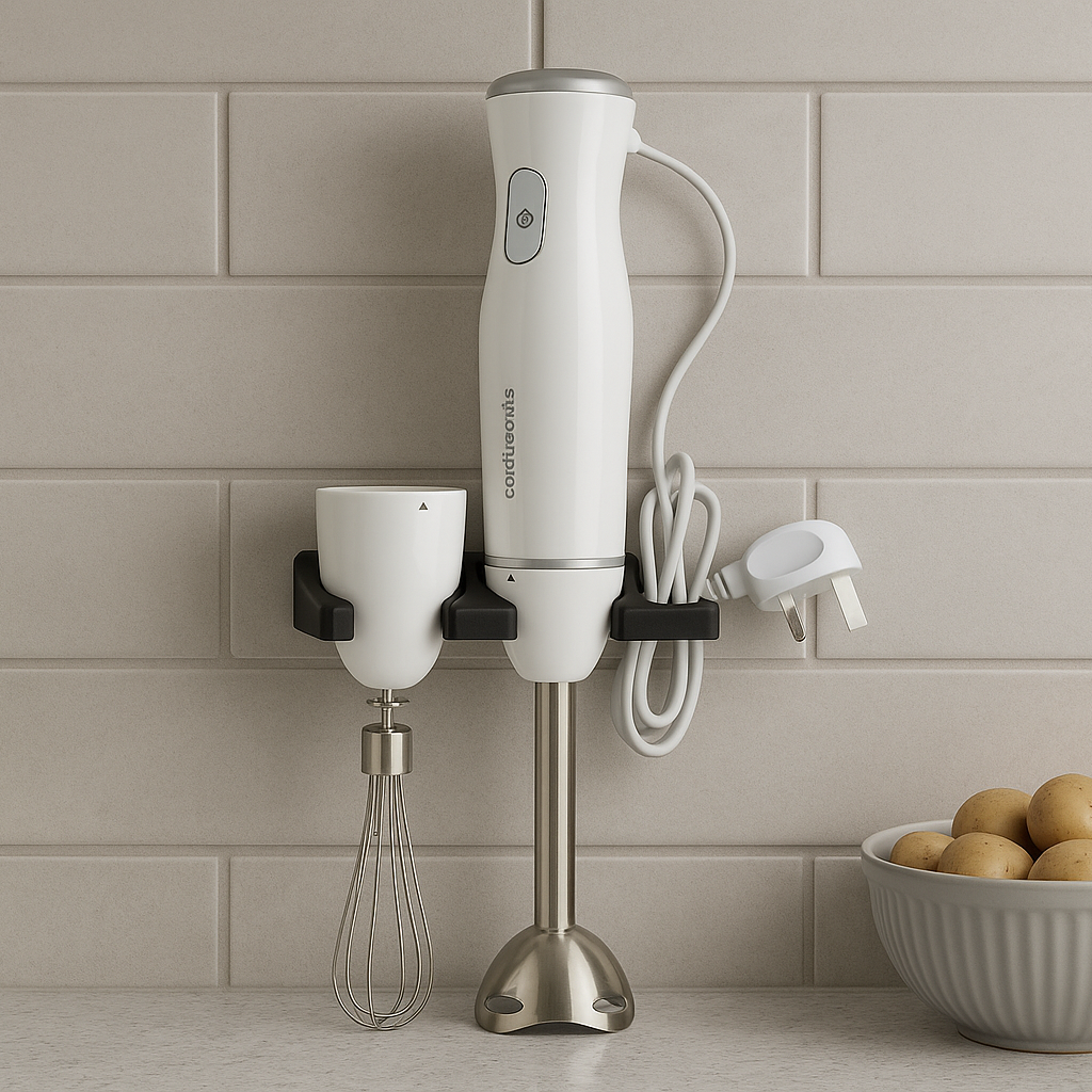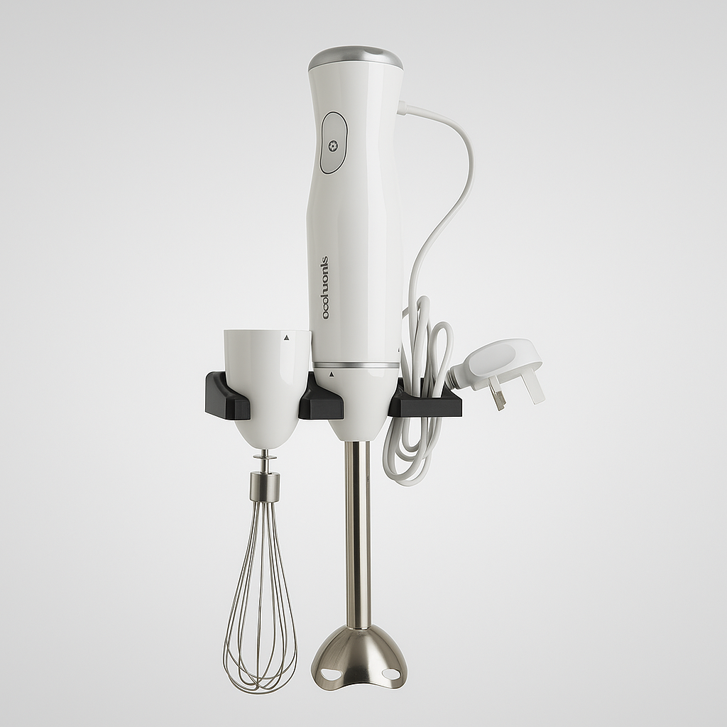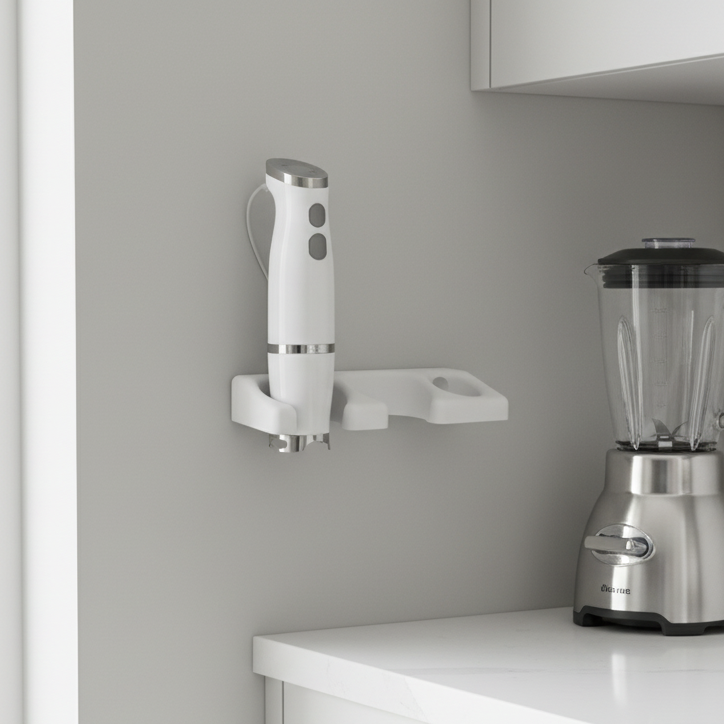 "Optimize your kitchen space and keep things tidy with this smart wall mount for your immersion blender. Designed to create a neat and functional environment, this mount allows you to easily store your immersion blender, its accessories, and the cord in one place. This frees up valuable cupboard space and keeps your kitchen countertops free of clutter.