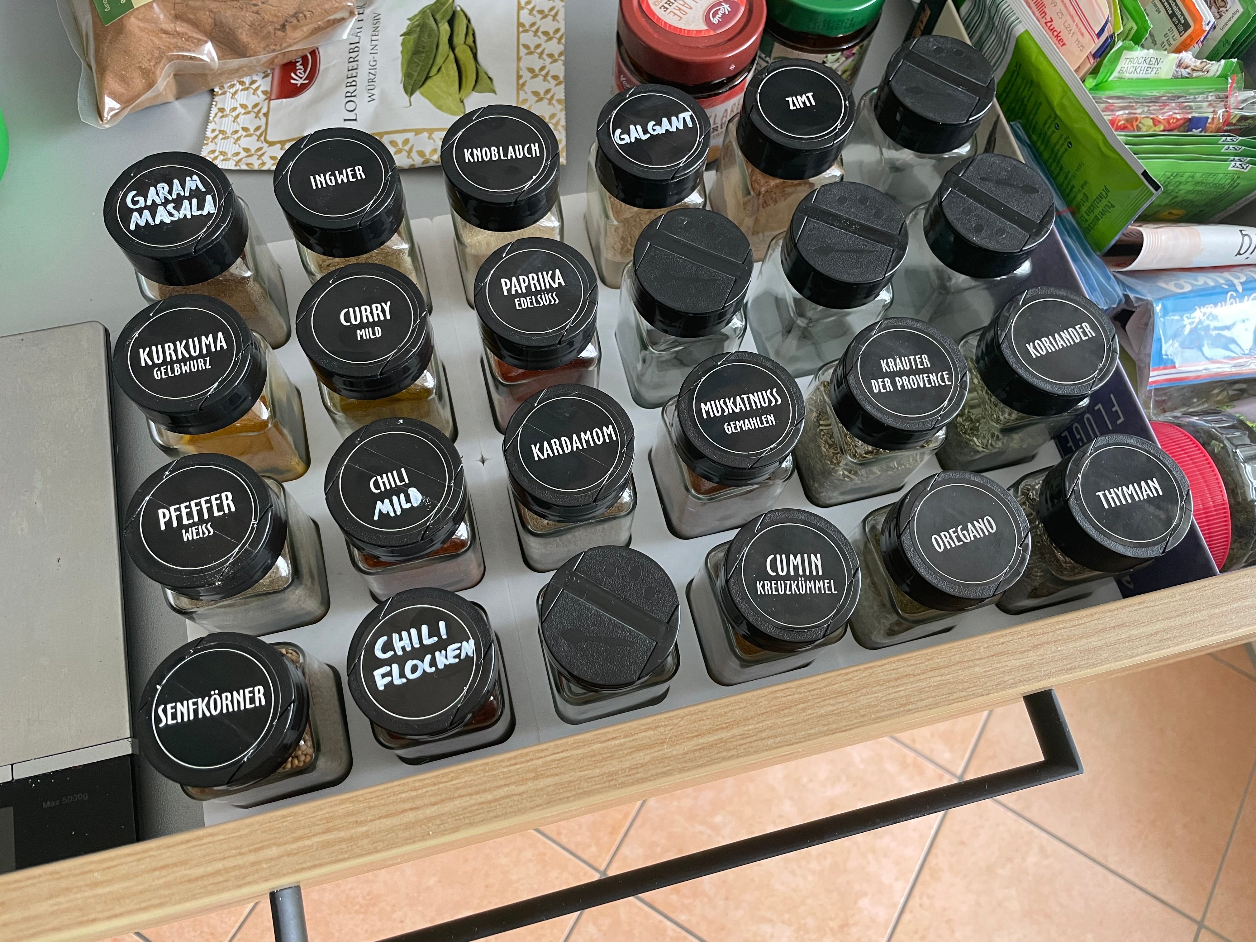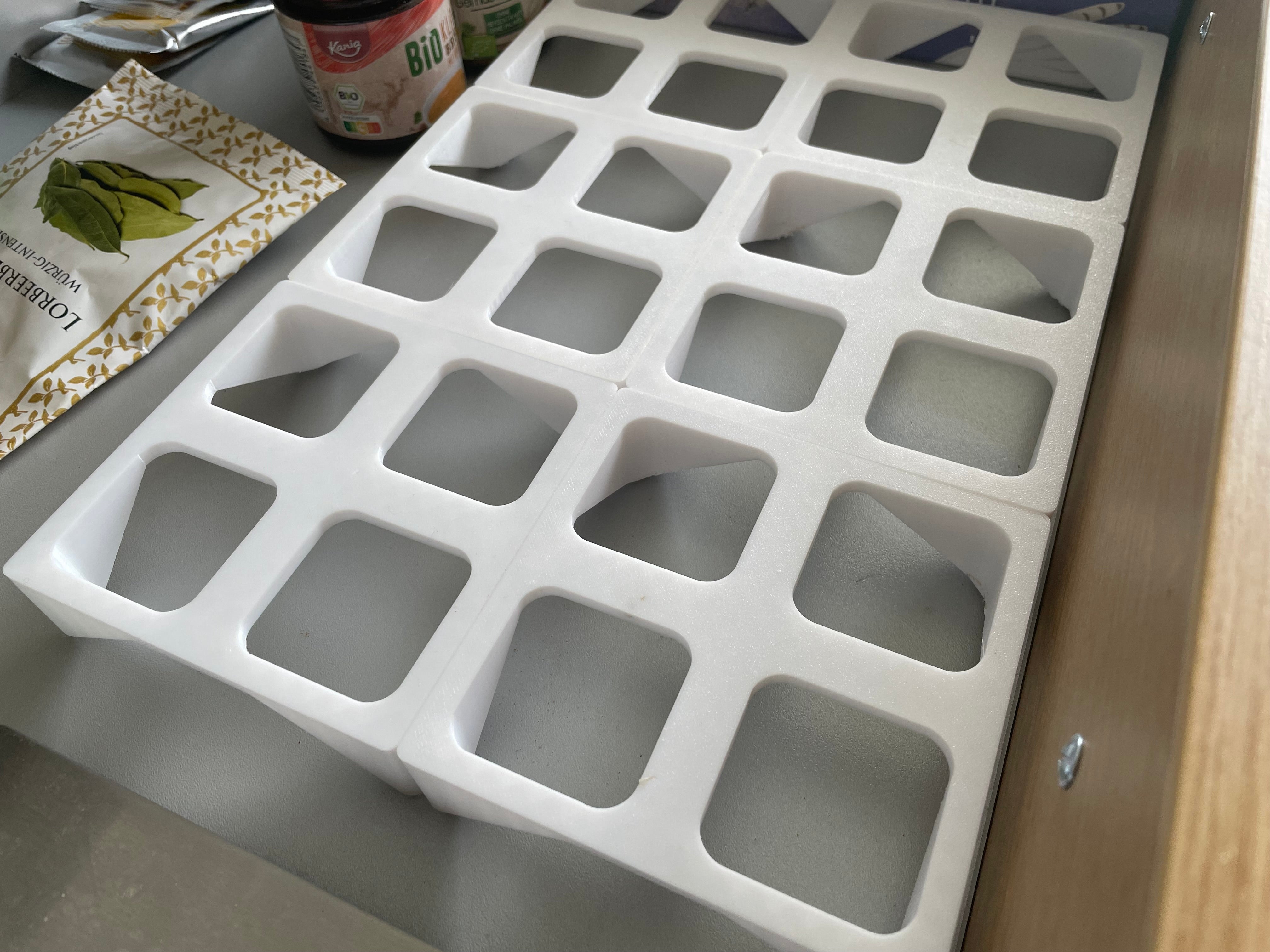 Η αποθήκευση μπαχαρικών μπορεί να εκτυπωθεί σε διάφορα μεγέθη, ώστε να ταιριάζει στο συρτάρι σας. Με τις υποδοχές στην κάτω πλευρά, μπορείτε εύκολα να συνδέσετε πολλές μονάδες για να δημιουργήσετε ένα μεγαλύτερο σύστημα, αυξάνοντας τη χωρητικότητα αποθήκευσης. Προσθέστε μαξιλαράκια για επιπλέον σταθερότητα και προστασία στις επιφάνειές σας.