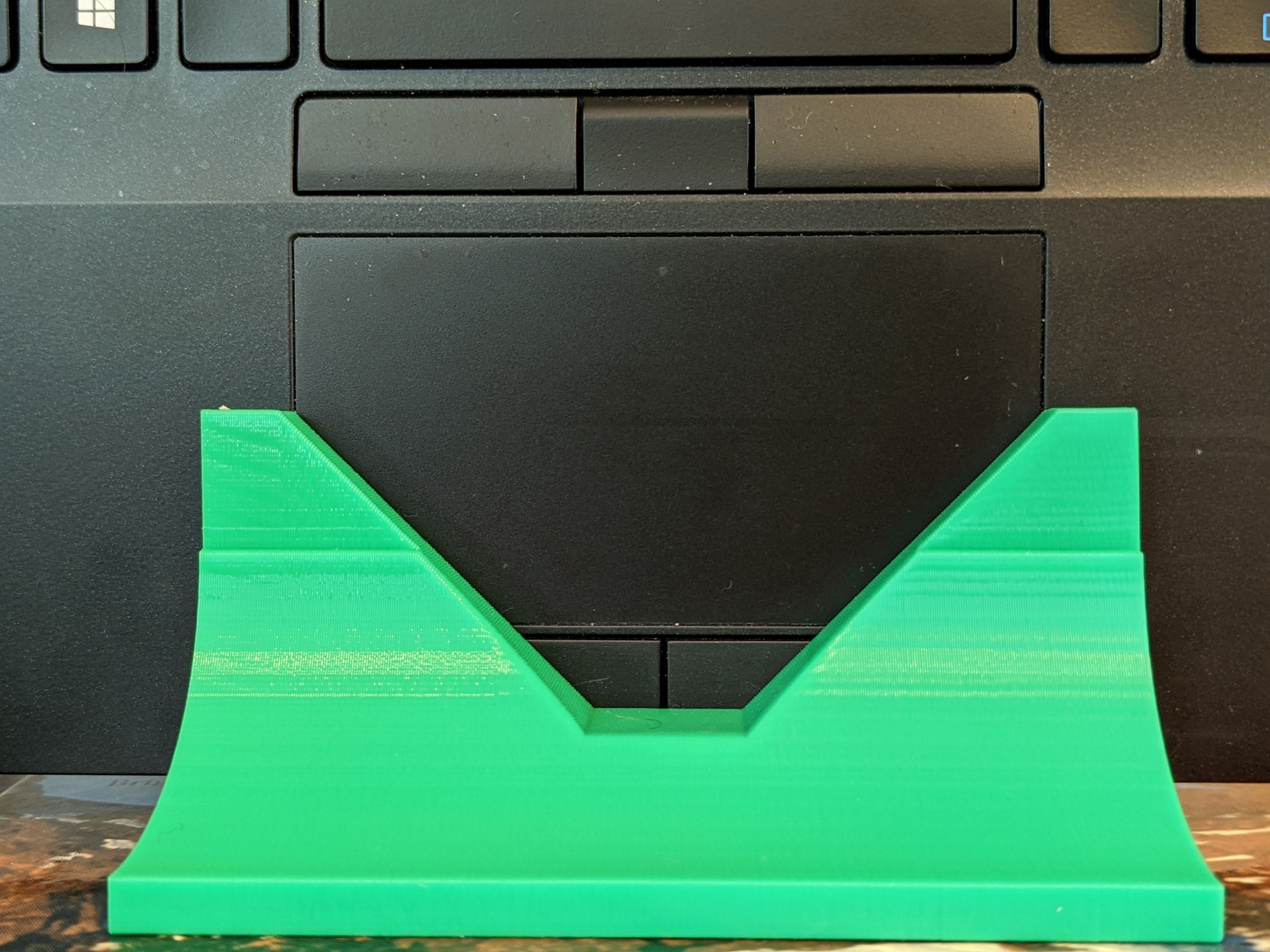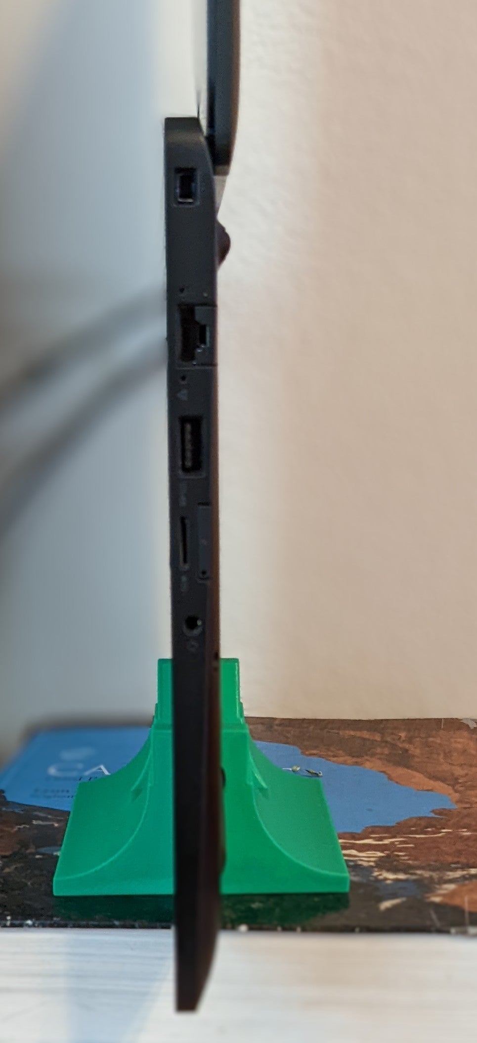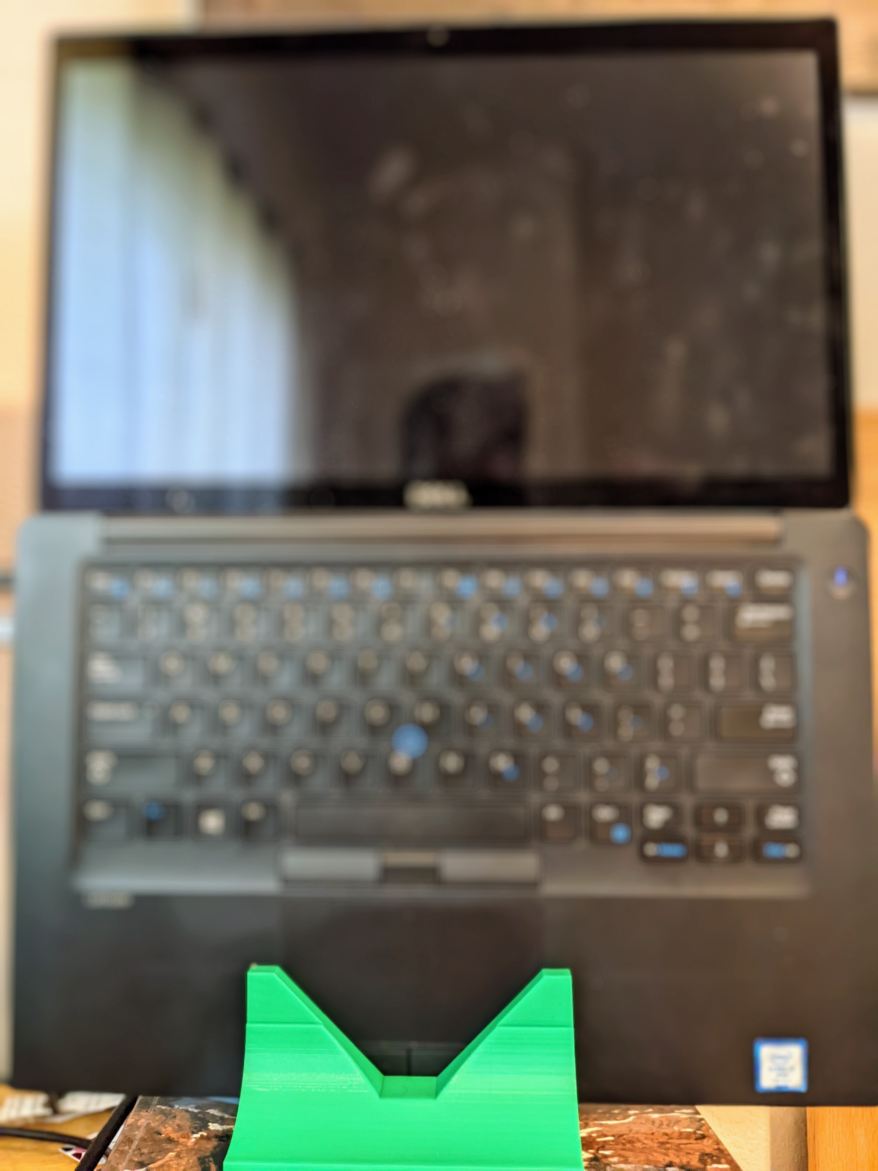 Αυτή είναι μια βάση στήριξης φορητού υπολογιστή για να κρατάει τον φορητό υπολογιστή Dell Latitude 7480 (~2018) σε όρθια θέση με την οθόνη ανοιχτή κατά 180 μοίρες. Η βάση τοποθετείται από κάτω ή ωθείται από το πλάι. Αυτή η τοποθέτηση της οθόνης καθιστά πιο εργονομική την εργασία όταν χρησιμοποιείτε εξωτερικό πληκτρολόγιο και ποντίκι. Σημειώστε ότι υπάρχει ένα κανάλι για το λαστιχάκι. Θα πρέπει να εφαρμόζει τέλεια: ωραία και άνετα χωρίς να είναι σφιχτό. Για να το αφαιρέσετε, σπρώξτε το και προς τις δύο πλευρές.