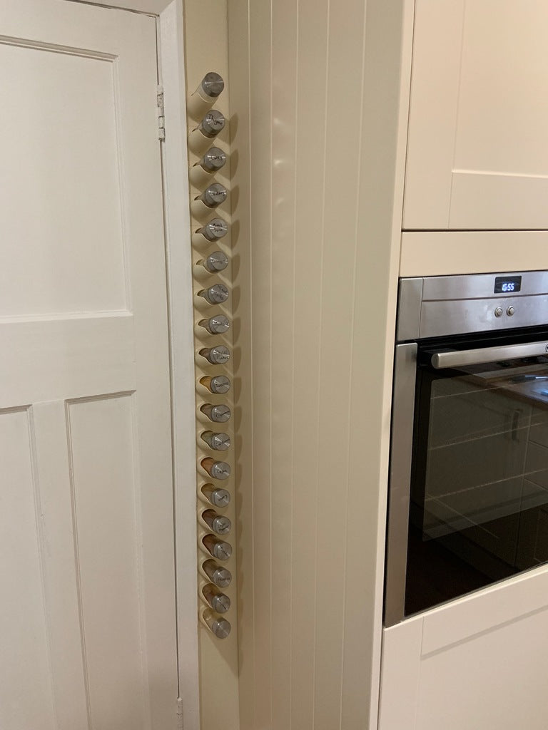 Η βάση μπορεί να στερεωθεί στον τοίχο με μια βίδα στο κάτω μέρος, αλλά μπορεί επίσης να τοποθετηθεί εύκολα με κολλητικό υλικό όπως το 'No Nails'. Ο συγκεκριμένος σχεδιασμός επιτρέπει την εύκολη τοποθέτηση και αφαίρεση των μπουκαλιών, ώστε να έχετε άμεση πρόσβαση στα αγαπημένα σας μπαχάρια. Η δευτερεύουσα άνοιξη στη βάση διασφαλίζει ότι μπορεί να βγει αέρας όταν εισάγονται τα μπουκάλια, διευκολύνοντας τη χρήση και τη συντήρηση.