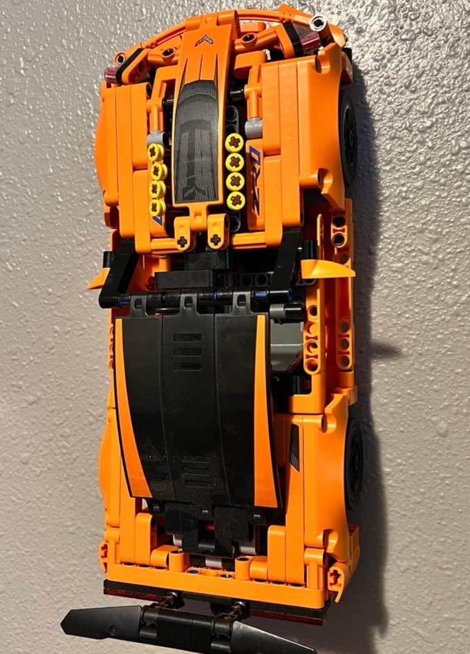 Απλό στήριγμα τοίχου για την πορτοκαλί κορβέτα Lego Technic (#42093). Αυτή η επιτοίχια βάση διευκολύνει την παρουσίαση του μοντέλου Lego με τακτοποιημένο και ευπαρουσίαστο τρόπο, ενώ παράλληλα διατηρεί τα κιτ σου οργανωμένα και προστατευμένα.