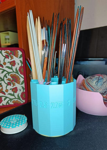 Αυτός ο περιστρεφόμενος οργανωτής βελόνων πλεξίματος έχει σχεδιαστεί για να οργανώνει τις βελόνες πλεξίματος διπλής αιχμής ανά μέγεθος, αλλά μπορεί επίσης να χρησιμοποιηθεί για την αποθήκευση αγκίστρων βελονάκι ή προμηθειών γραφείου. Διαθέτει δώδεκα εξωτερικές θήκες και μια ελαφρώς ψηλότερη και μεγαλύτερη στο κέντρο. Εάν δεν χρειάζεται να περιστρέφεται, μπορεί να εκτυπωθεί χωρίς βάση.