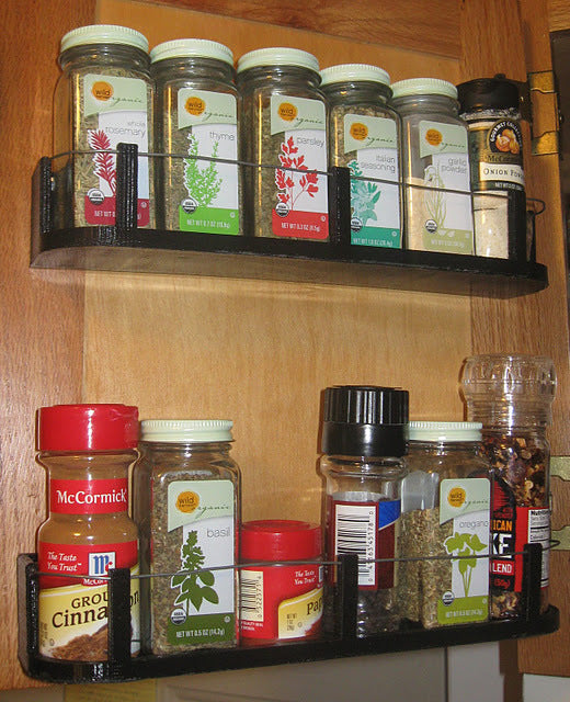Αυτό είναι ένα ράφι μπαχαρικών που σχεδιάστηκε για να βιδώνεται στις πόρτες των ντουλαπιών της κουζίνας μου. Κρατάει μια ποικιλία μπαχαρικών και παρέχει εύκολη πρόσβαση σε αυτά κατά τη διάρκεια του μαγειρέματος. Ιδανικό για την οργάνωση των ντουλαπιών της κουζίνας και τη διατήρηση της συλλογής μπαχαρικών σας σε τάξη.