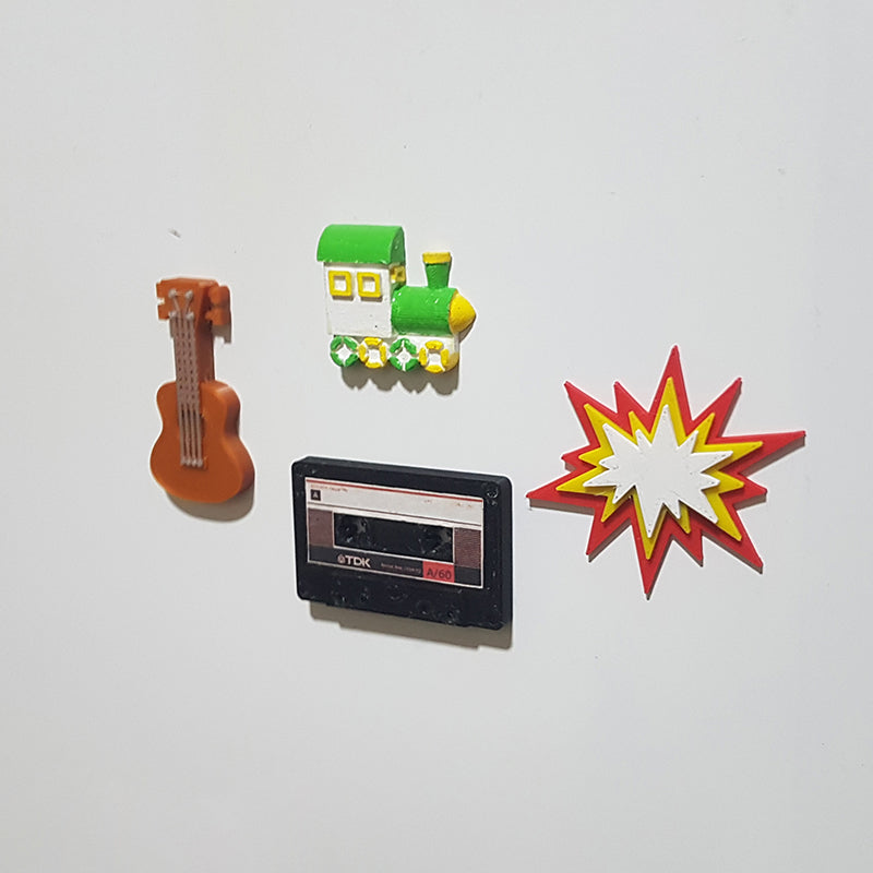 Χειροποίητο ζωγραφισμένο τρένο και κιθάρα μαγνήτες ψυγείου με πρότυπο κασέτας