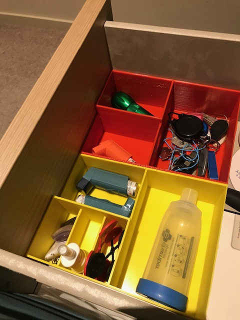 Το καθένα είναι φτιαγμένο για να χωράει στο 1/4 του κομοδίνου Ikea 'MALM', οπότε μη διστάσετε να εκτυπώσετε 1, 2, 3 ή 4 από αυτά το καθένα. συρτάρι κρεβατιού. Προσωπικά, εκτύπωσα μόνο ένα αριστερά και δεξιά για να κάθεται στο μπροστινό μέρος του συρταριού και ένα για το πίσω μέρος, αλλά μπορούσες να τα προσανατολίσεις όπως θέλεις.