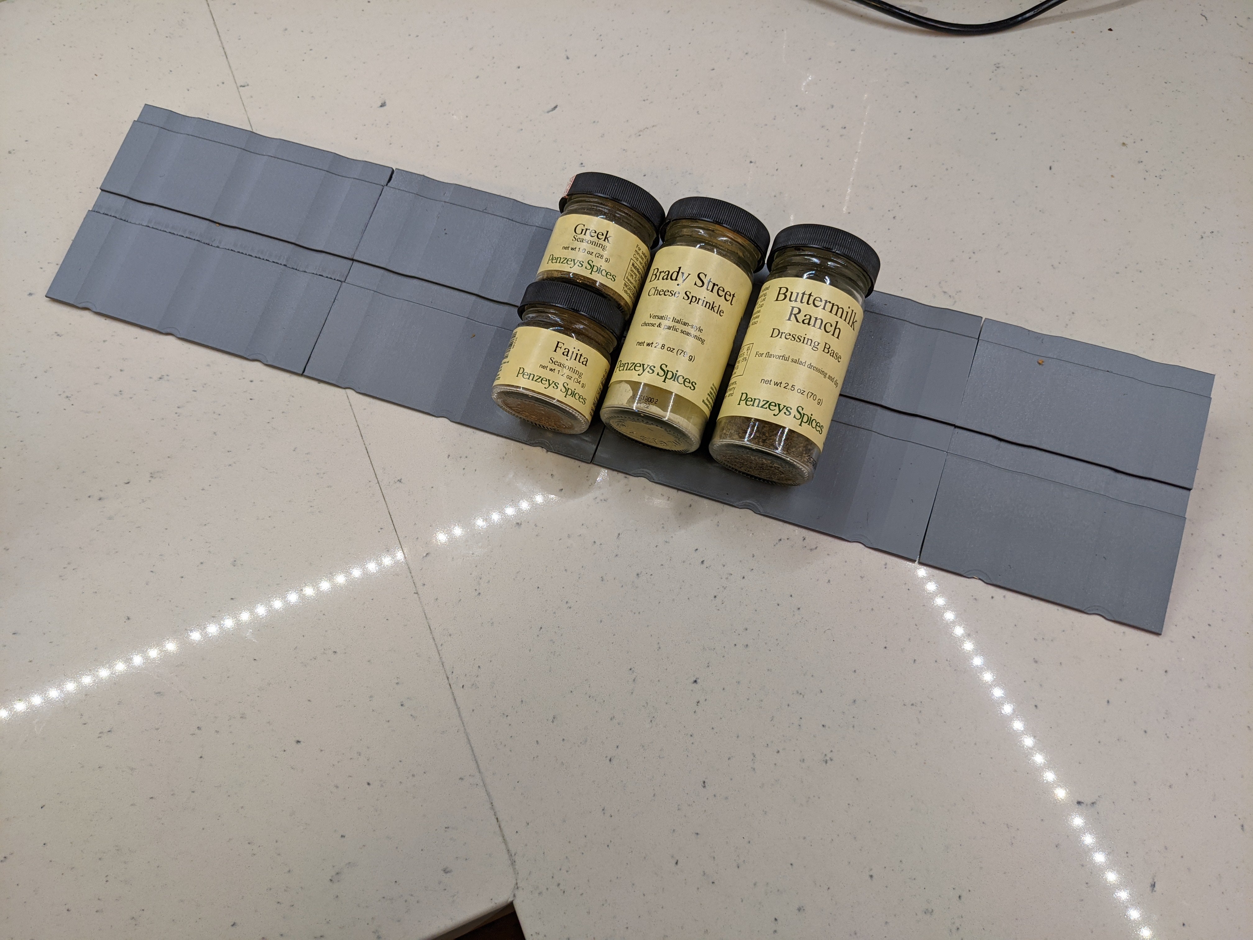 Αυτό είναι ένα ράφι μπαχαρικών σε σχήμα συρταριού από την Penzys που έχει σχεδιαστεί για να χωράει είτε δύο βάζα μπαχαρικών 1/4 φλιτζανιού είτε ένα βάζο μπαχαρικών 1/2 φλιτζανιού Penzys. Το κάτω μέρος των τεμαχίων διαθέτει ράγα DIN που επιτρέπει την ένωση πολλαπλών εκτυπώσεων μεταξύ τους με ένα συμπαγές πλαίσιο.