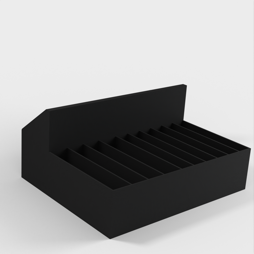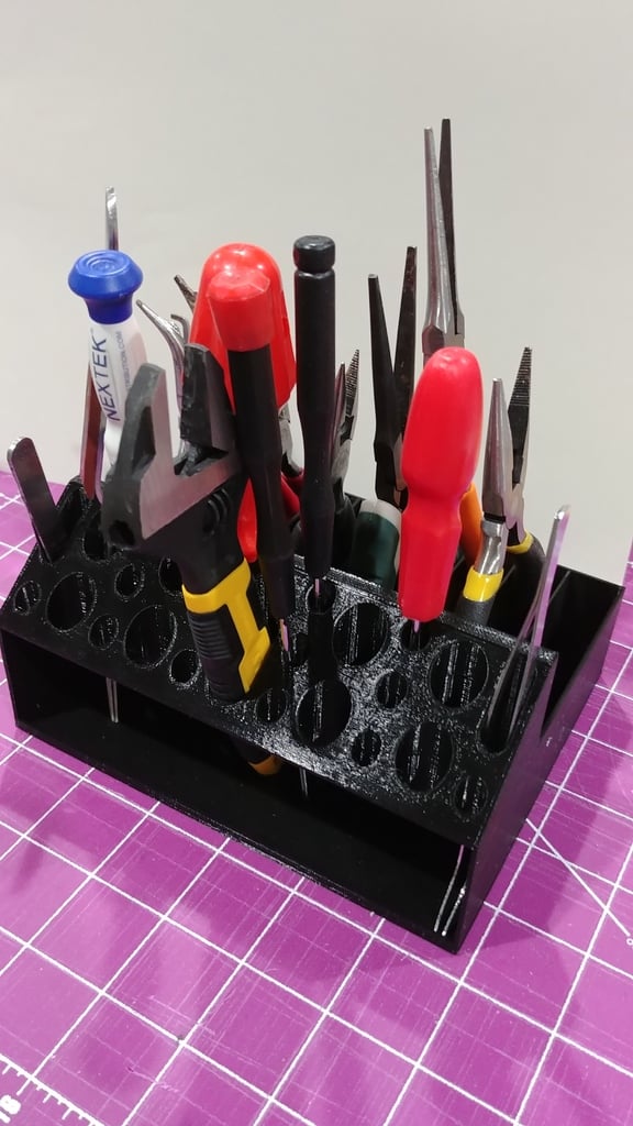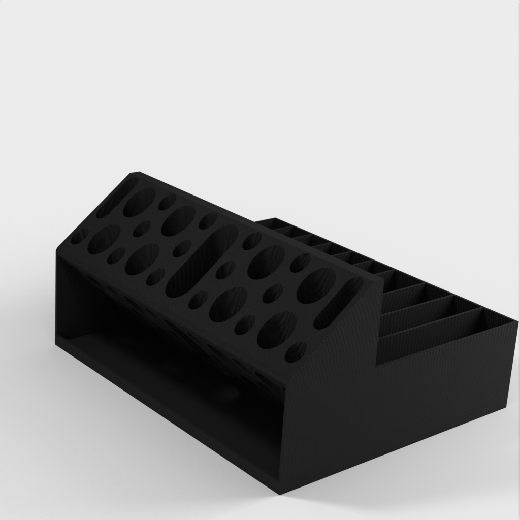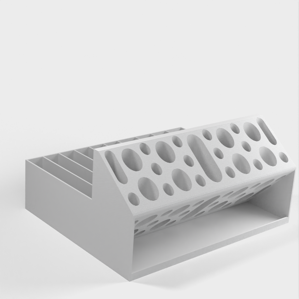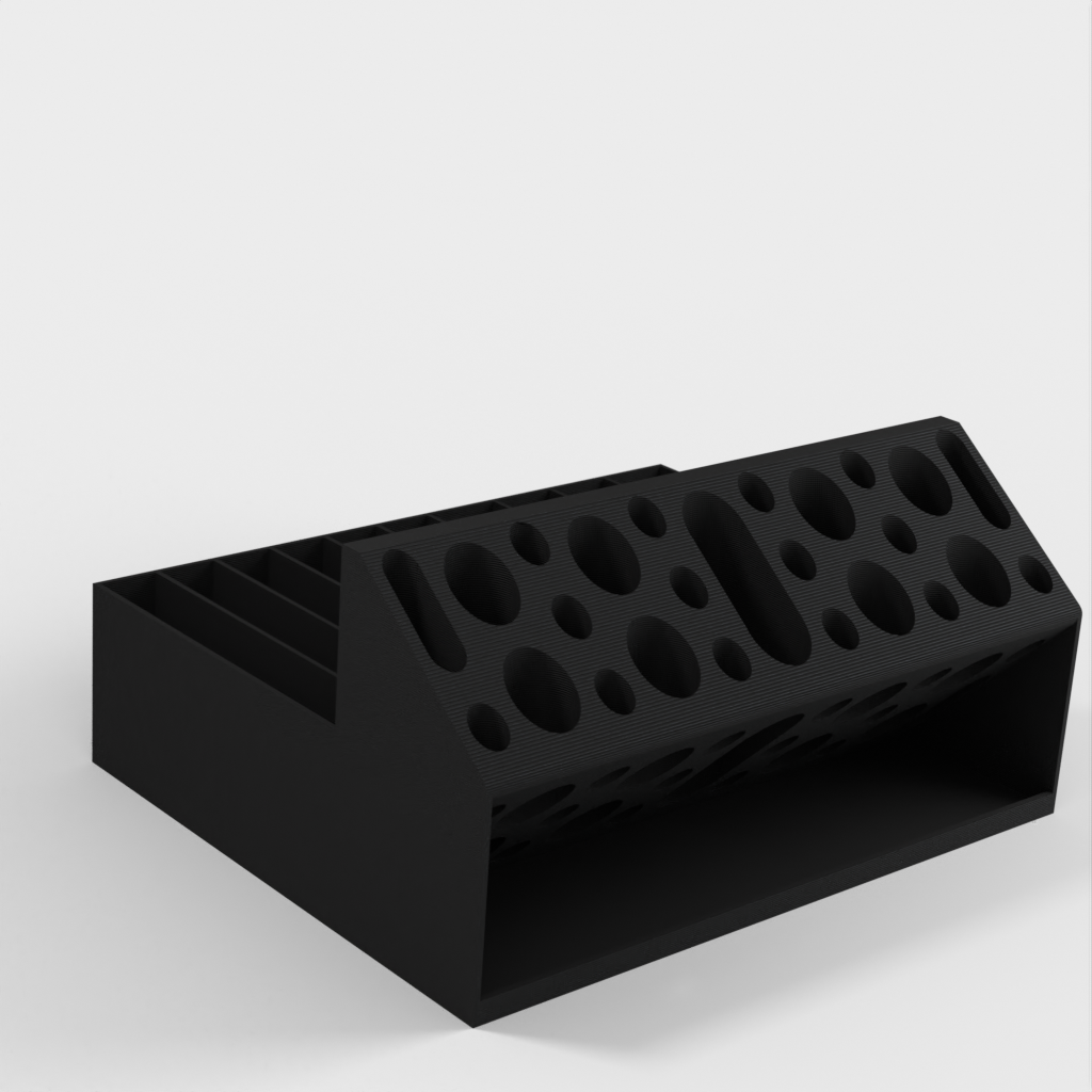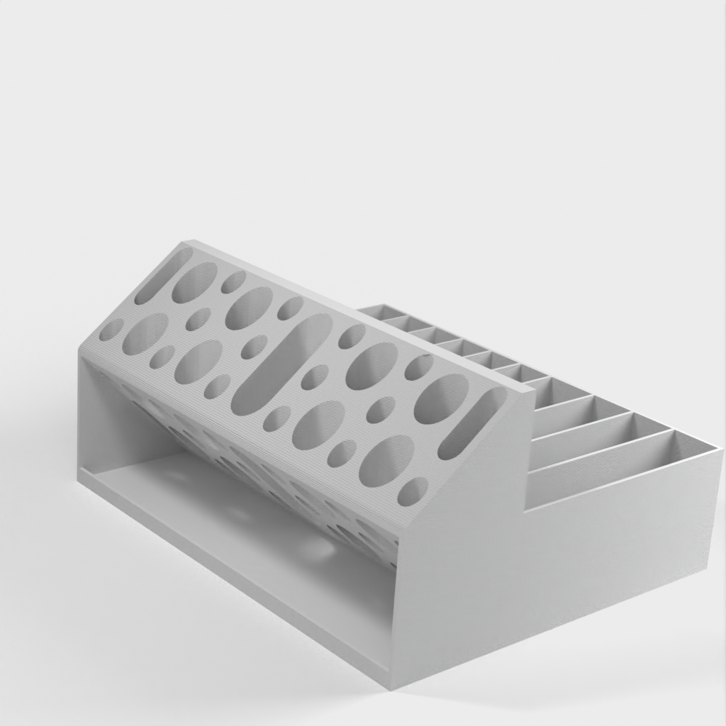 Αυτή η θήκη πένσας Remix έχει σχεδιαστεί για να οργανώνετε ευκολότερα τη συλλογή εργαλείων σας. Διαθέτει μεγαλύτερες οβάλ οπές για να χωρέσει ένα μισοφέγγαρο κλειδί και ευρύτερες υποδοχές για παχύτερες λαβές πένσας. Στο κάτω μέρος του τμήματος με τις στρογγυλές οπές έχει προστεθεί ένα χείλος για να αποτρέψει την ολίσθηση/διαφυγή μικρότερων αντικειμένων. Ιδανικό για τρισδιάστατους εκτυπωτές, χομπίστες, οργάνωση γραφείου και αποθήκευση σε εργαστήρια.