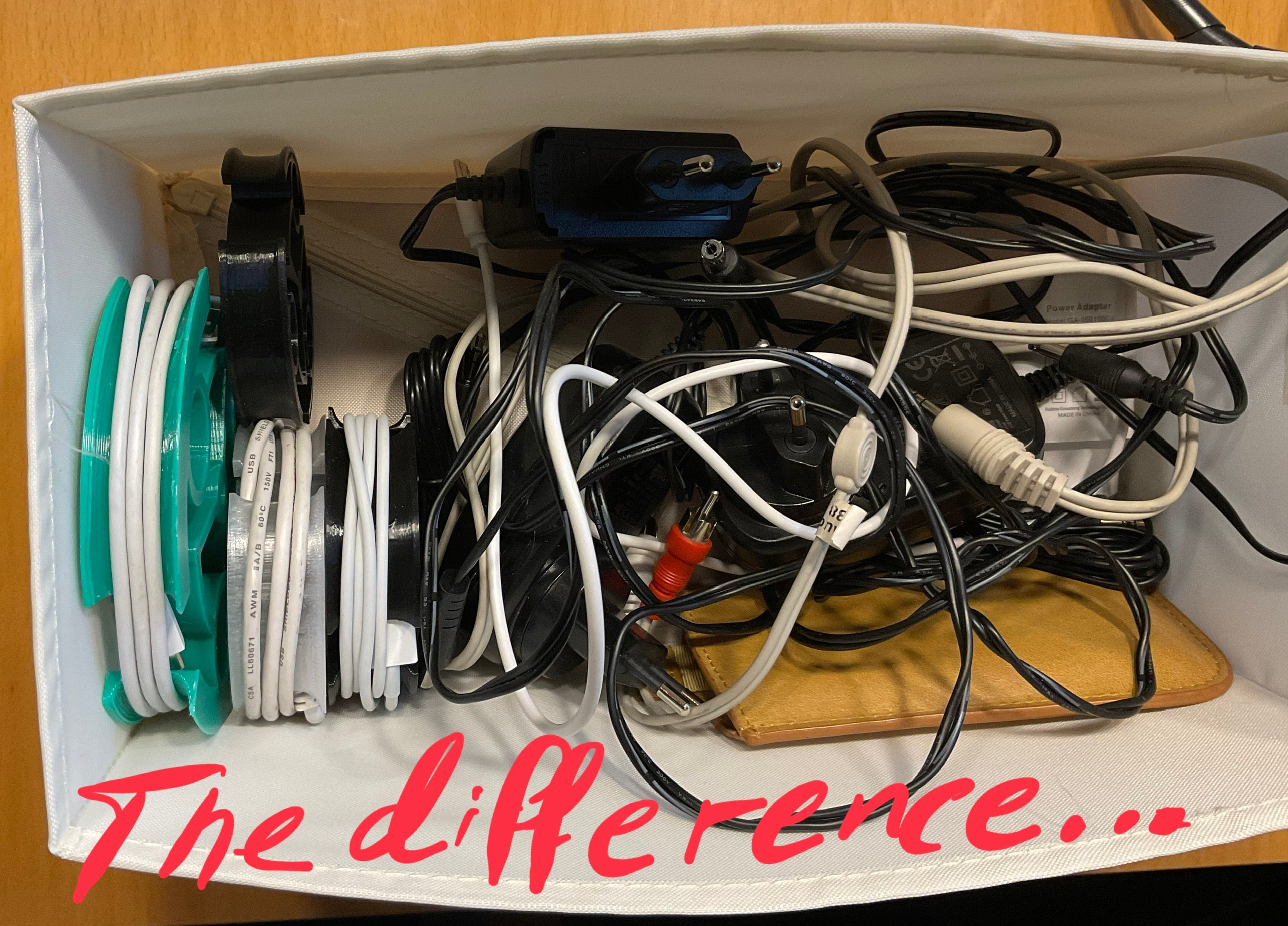 • Hjælper med at skabe orden i skuffen, da kablerne kan stables som filmruller for at reducere tryk.