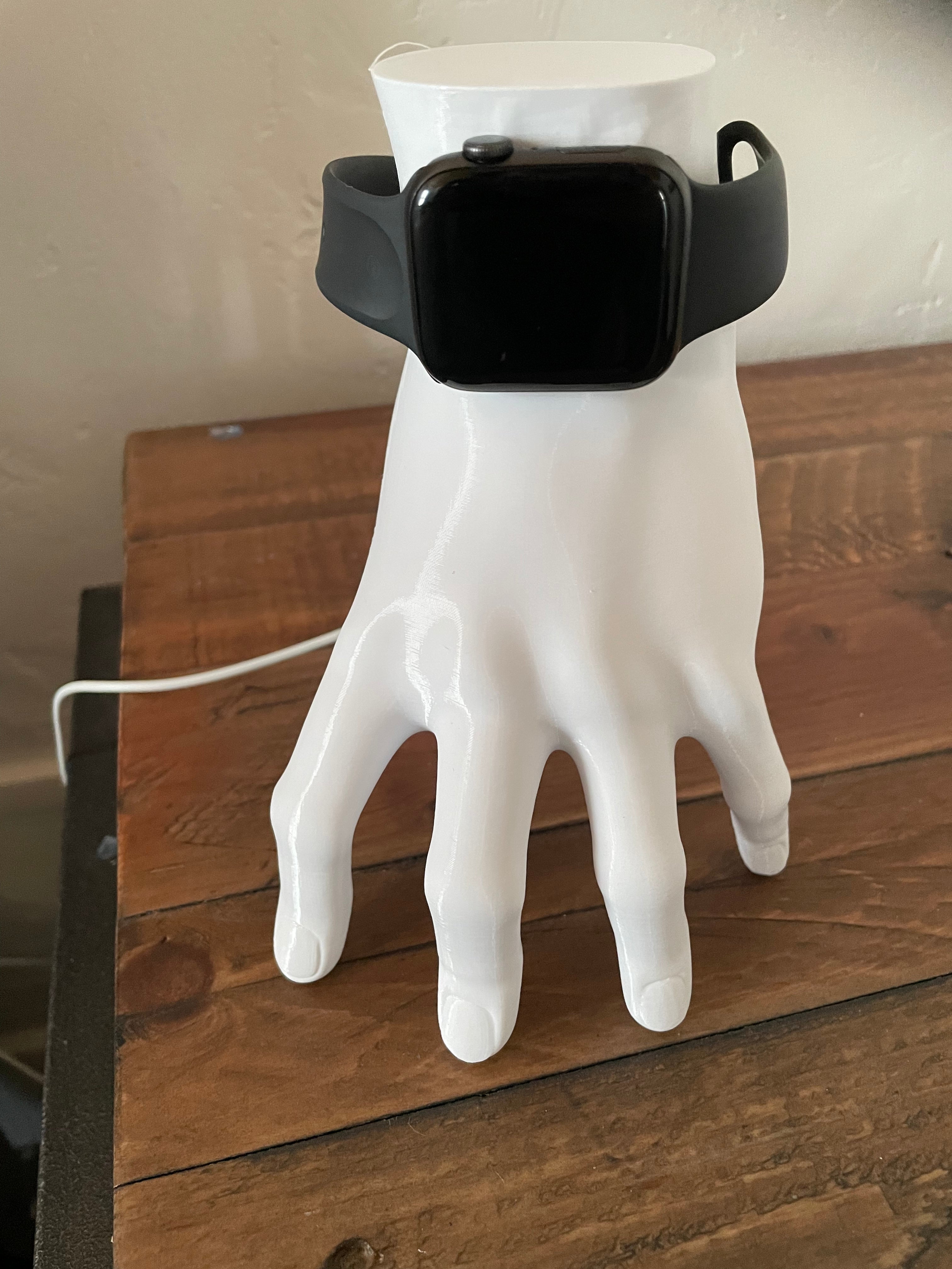 Απλή και κομψή θήκη ρολογιού για Apple Watch, σχεδιασμένη σαν χέρι. Ο ασύρματος φορτιστής μπορεί να τοποθετηθεί μέσα στο χέρι και η συναρμολόγηση δεν απαιτεί χρήση κόλλας. Με αυτήν τη θήκη, το Apple Watch σας έχει μια όμορφη και πρακτική θέση στο κομοδίνο, στο γραφείο σας ή όπου αλλού θέλετε να το έχετε.