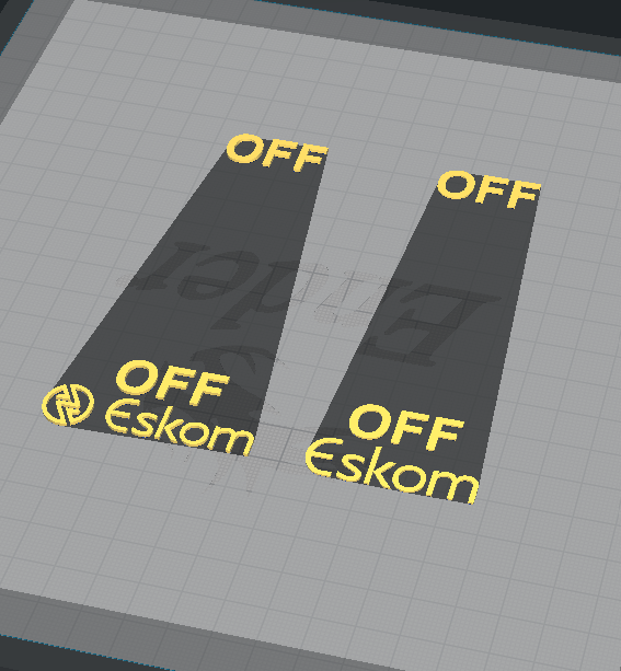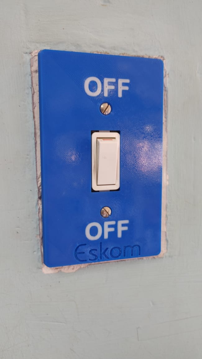 Αυτό είναι ένα εξώφυλλο διακόπτη φωτός με μια χιουμοριστική απεικόνιση της κατάστασης 'διακοπής φορτίου' που όλοι οι Νοτιοαφρικανοί γνωρίζουν και φοβούνται. Υπάρχουν τέσσερα ξεχωριστά αρχεία με το κείμενο διαχωρισμένο από την πλάκα, ώστε να μπορείτε να συναρμολογήσετε τα μοντέλα στον τεμαχιστή σας και να κάνετε μια δίχρωμη εκτύπωση.
