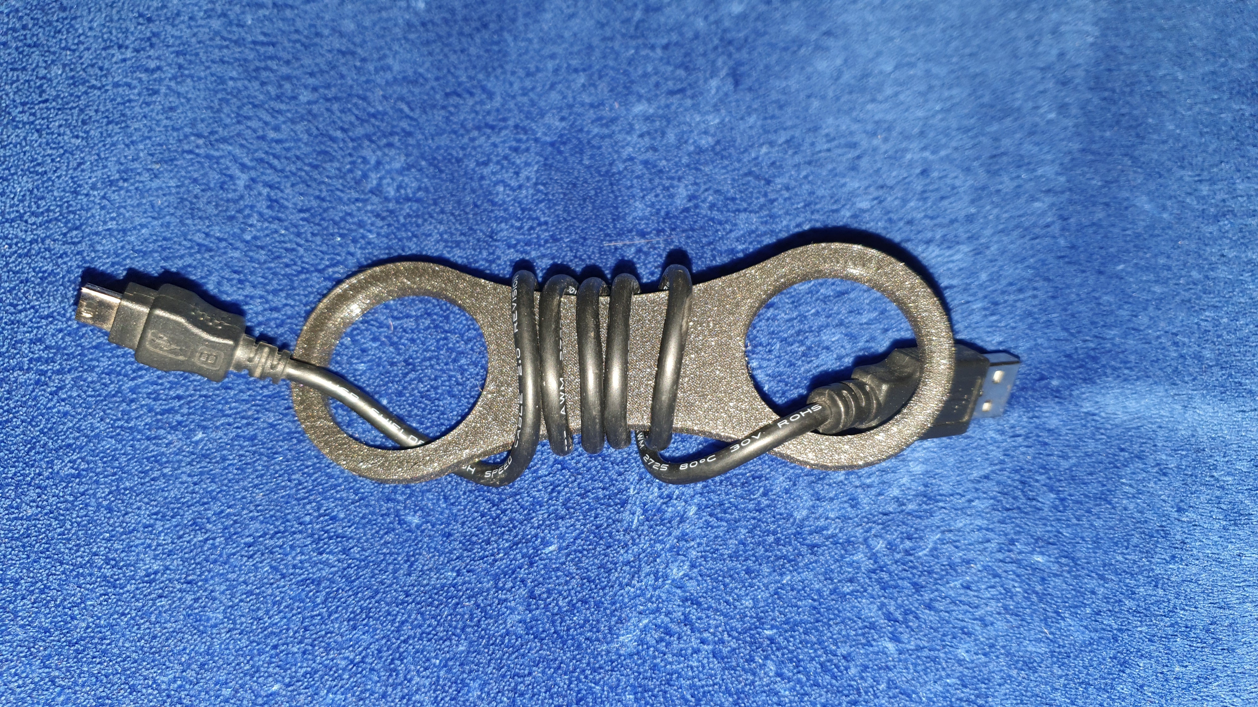 Αυτή είναι μια θήκη καλωδίων που σας διευκολύνει να οργανώσετε την ακαταστασία των καλωδίων σας. Απλώς τοποθετήστε το ένα άκρο του καλωδίου στη μία τρύπα, τυλίξτε το καλώδιο γύρω από το κέντρο και τοποθετήστε το άλλο άκρο του καλωδίου στην άλλη τρύπα. Είναι μια απλή και αποτελεσματική λύση για την οργάνωση των καλωδίων σας.