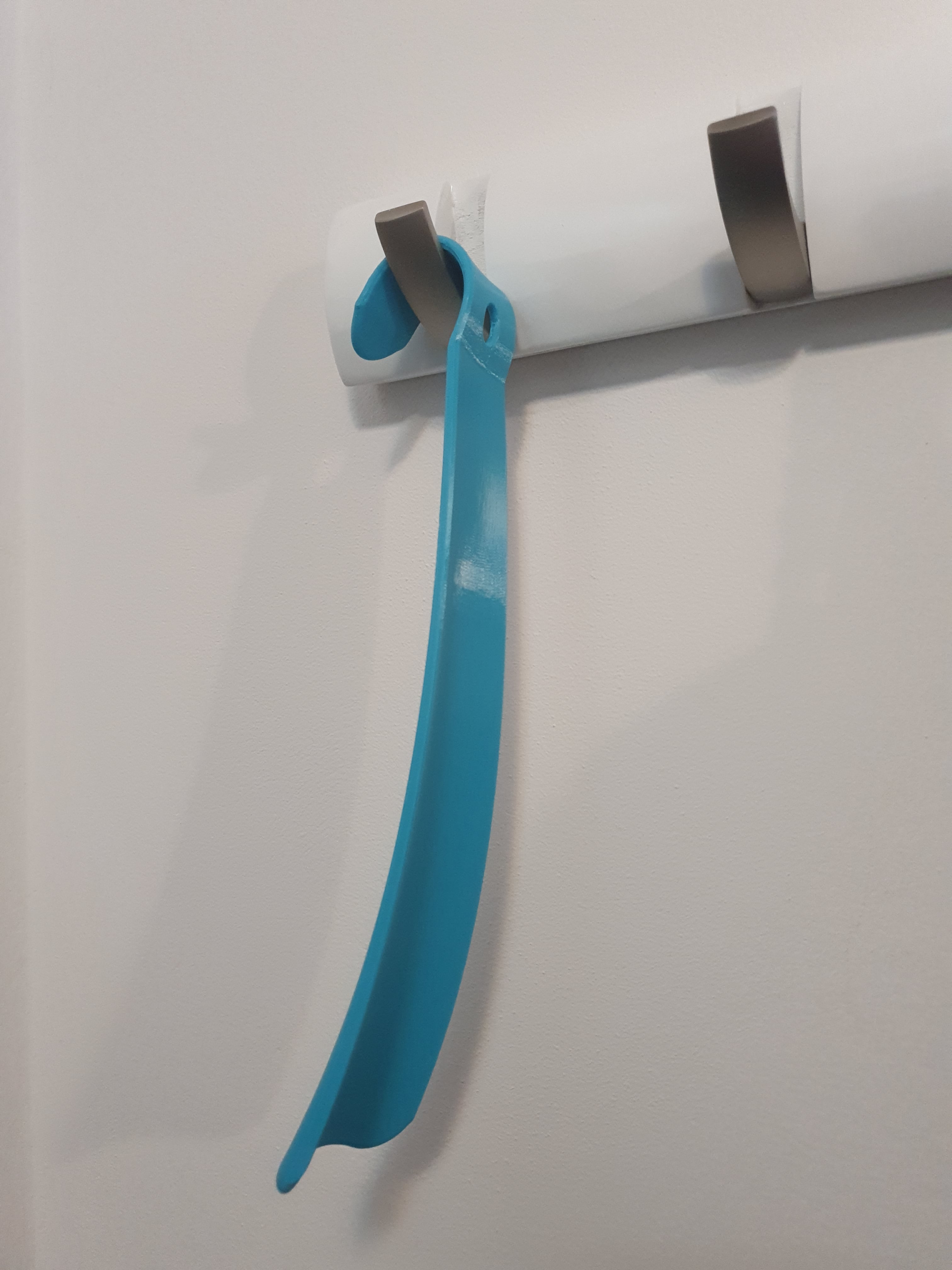 Μεγάλο κέρατο παπουτσιών με γωνιακό άκρο που του επιτρέπει να κρεμαστεί σε οποιαδήποτε κρεμάστρα. Το μακρύ του σχήμα (27,8 cm) είναι ιδανικό για όσους δυσκολεύονται να φτάσουν τα πόδια τους. Δεν απαιτείται στήριξη για αυτό το προϊόν. Σημαντικό να σημειωθεί, είναι ζωτικής σημασίας να βαφτεί η ραφή στο εσωτερικό του στρογγυλού μέρους για να αποφευχθούν ανεπιθύμητα τεχνουργήματα.