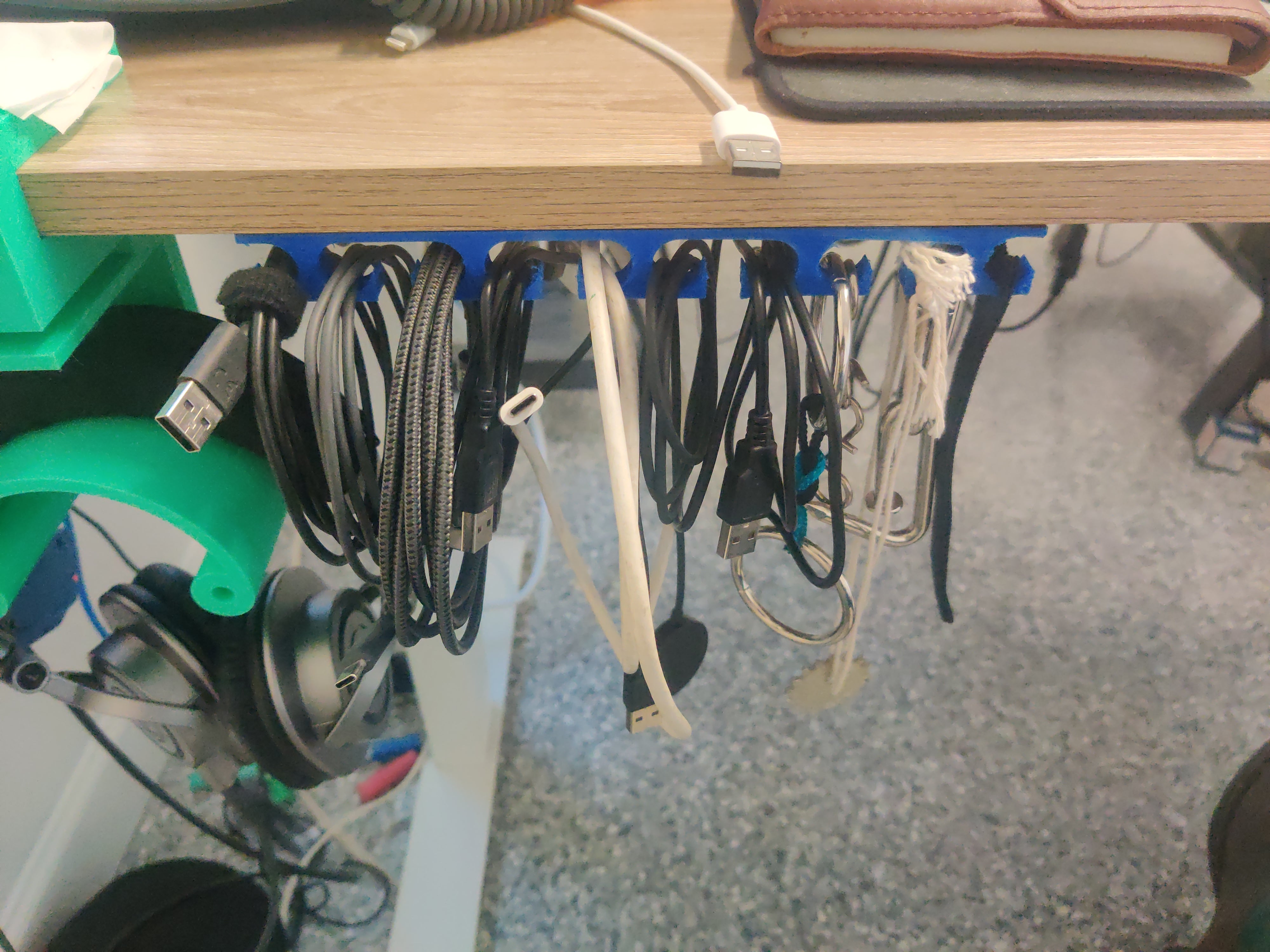 Αυτή είναι μια μικρή συσκευή οργάνωσης καλωδίων που έφτιαξα για να διατηρώ τα καλώδια USB τακτοποιημένα στο γραφείο μου. Το τοποθέτησα κάτω από το γραφείο μου χρησιμοποιώντας ταινία διπλής όψης. Προσωπικά χρησιμοποίησα ταινία Tesa 10mm, αλλά μπορεί επίσης να χρησιμοποιηθεί ταινία 3M. Αυτό το προϊόν βοηθάει να διατηρήσετε το χώρο σας τακτοποιημένο και καθαρό, οργανώνοντας τα καλώδια USB εύκολα και αποτελεσματικά.
