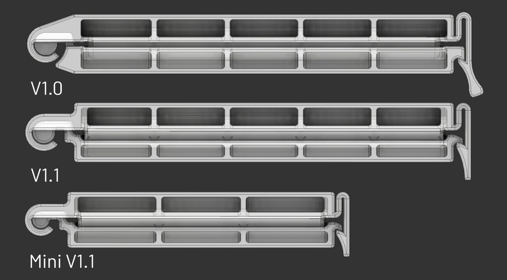 Παρέχονται αρχεία STL για κλιπ 100mm και 160mm- είναι δυνατόν να κατασκευαστούν μεγαλύτερα μεγέθη. Περιλαμβάνονται τα πρωτότυπα αρχεία CAD Solidworks για προσαρμογή.