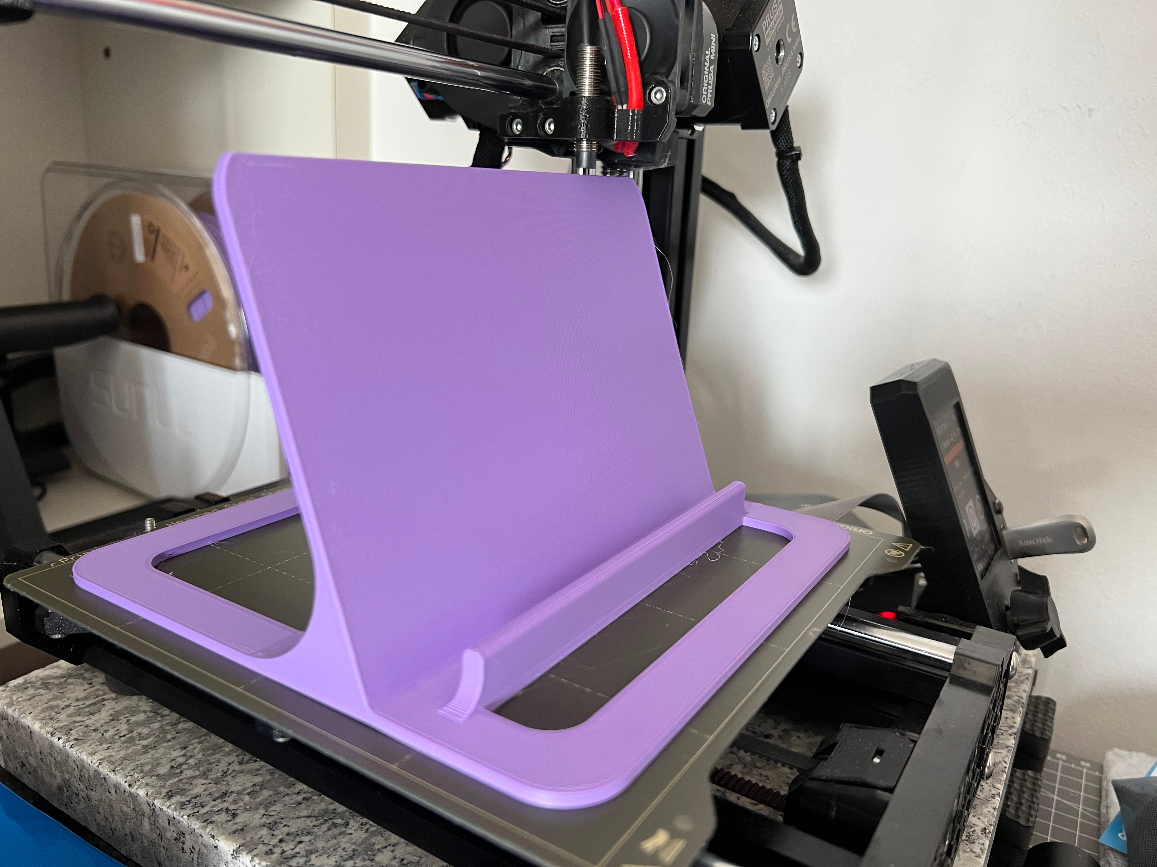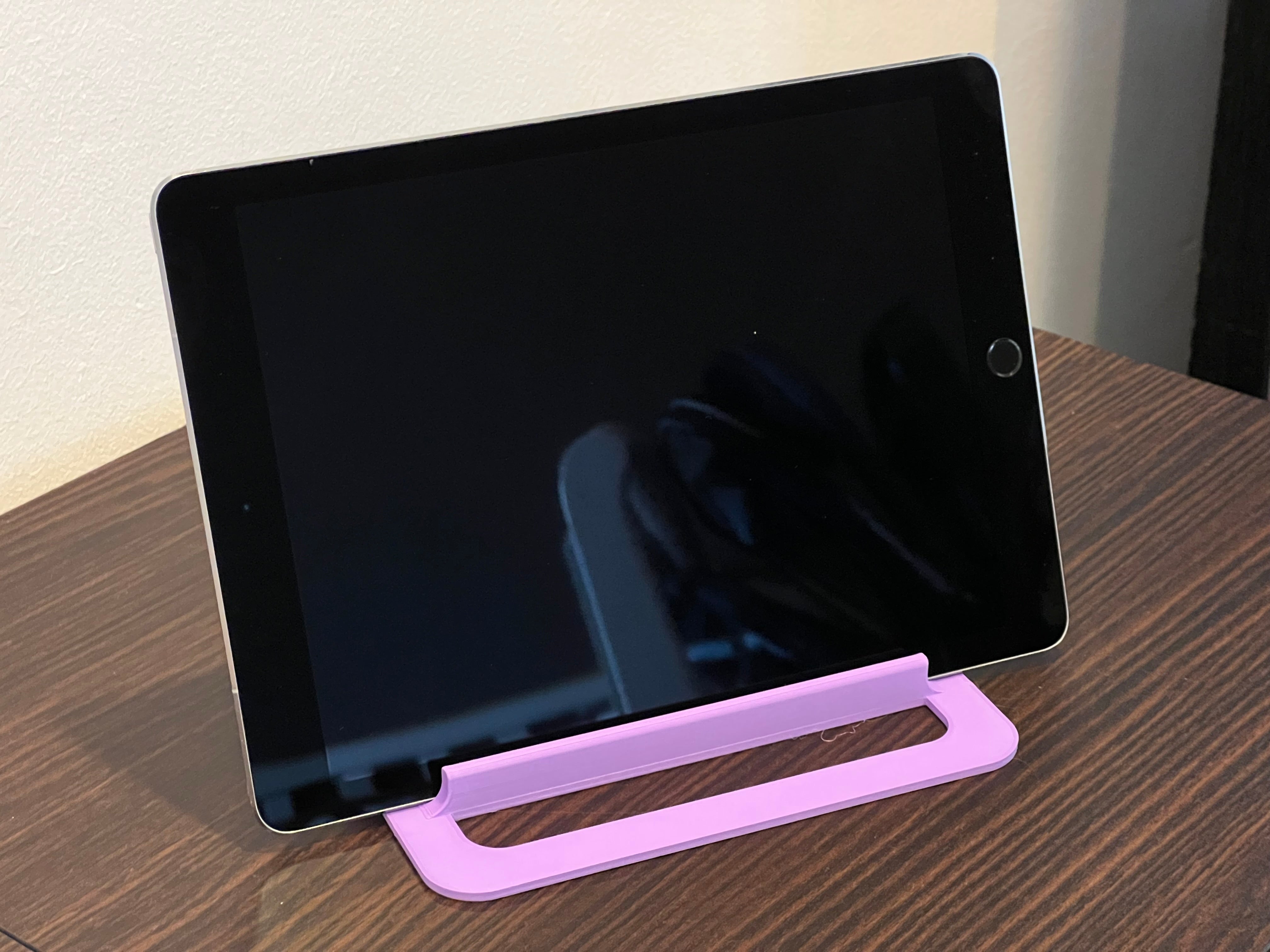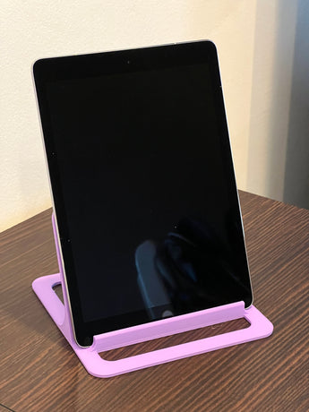 Αυτή είναι μια απλή βάση iPad που είναι ελαφρώς μεγαλύτερη από το συνηθισμένο για να εξασφαλίζει σταθερότητα σε πιο μαλακές επιφάνειες όπως το κρεβάτι. Ταιριάζει στα περισσότερα iPad με και χωρίς θήκες. Εκτυπώνεται σε πολυμερές PolyTerra Purple. Περιλαμβάνονται τα αρχεία Fusion360 και STEP.