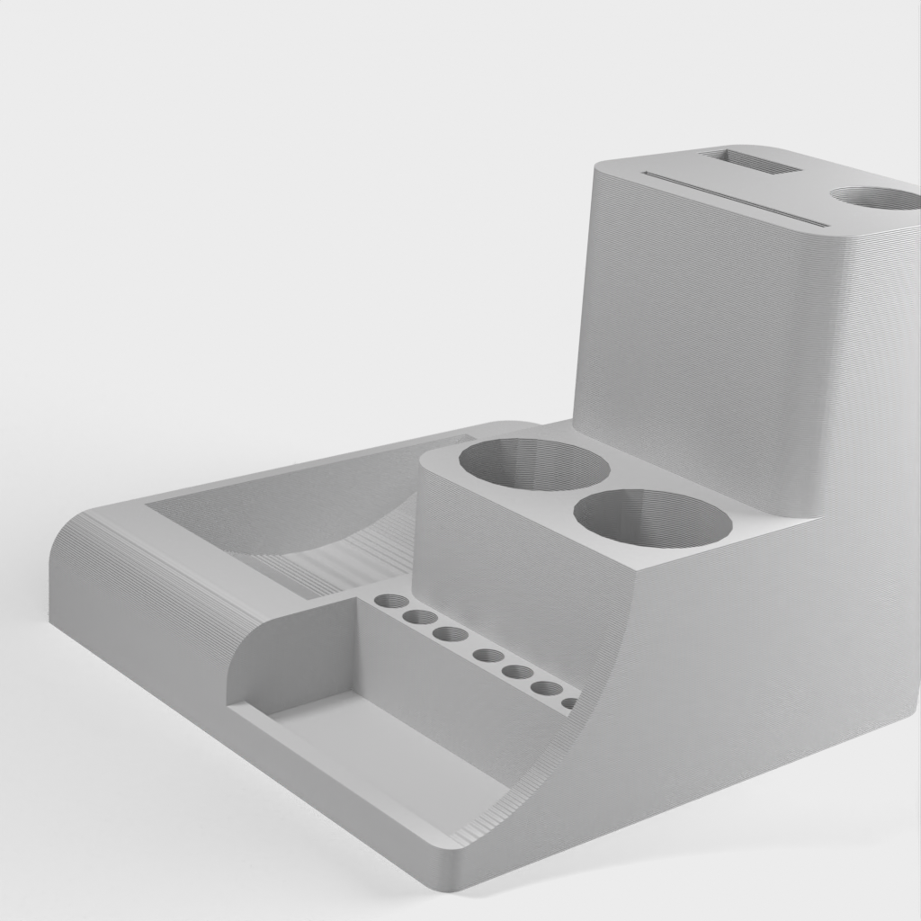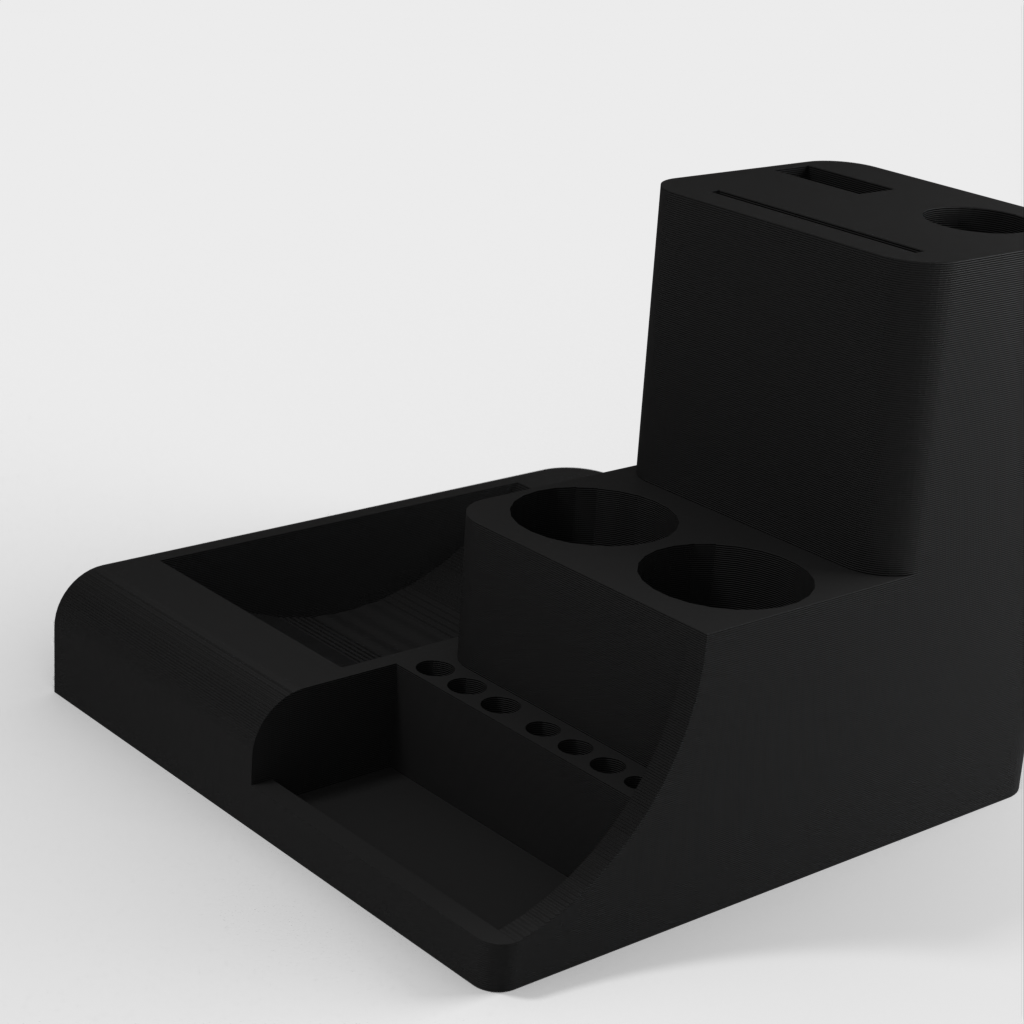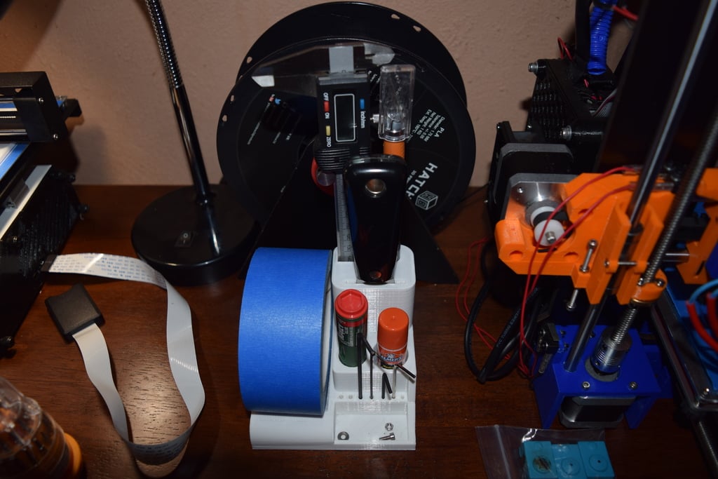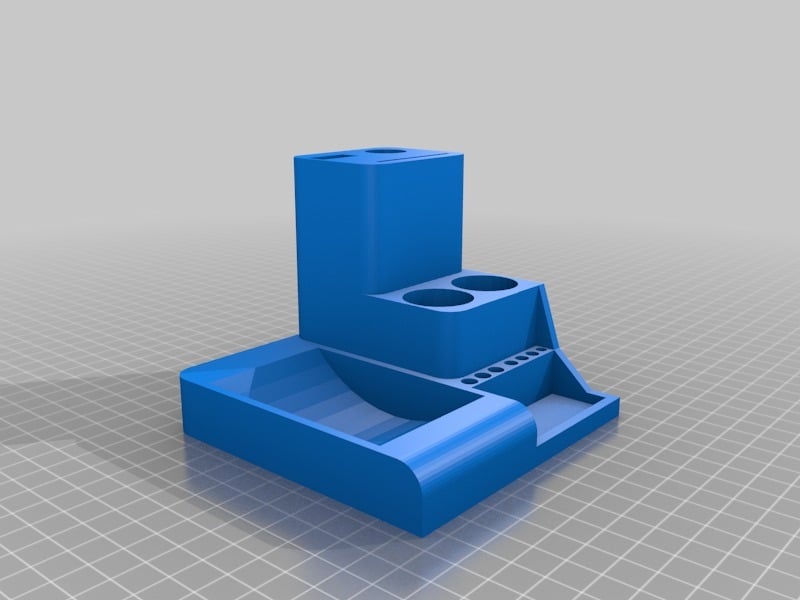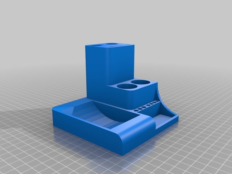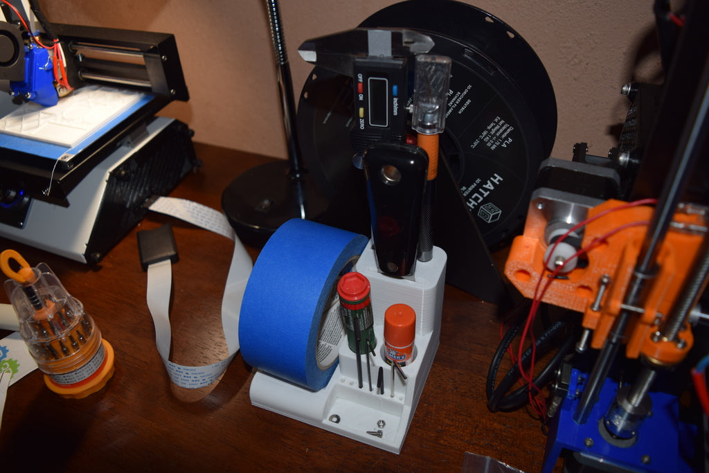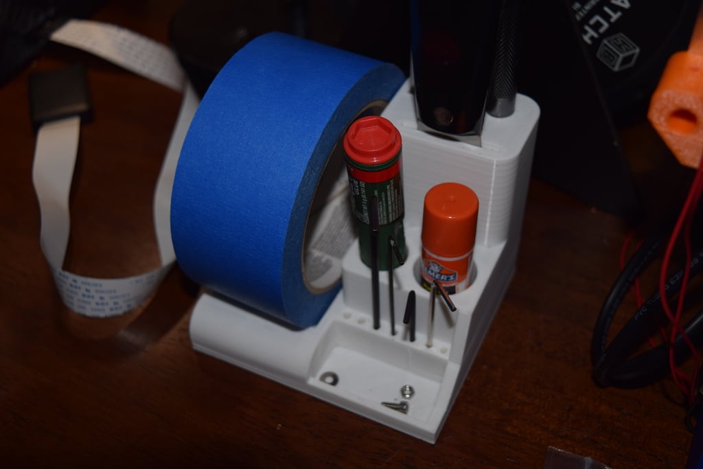 Θήκη εργαλείων για εκτυπωτή 3D, σχεδιασμένη για να κρατάτε τα εργαλεία σας οργανωμένα. Ικανή να συγκρατήσει ένα ευρύ φάσμα αντικειμένων, από φακό, ράβδο κόλλας ή κόλλα krazy glue, μέχρι ξύστρα πλάτους 38,2 mm. Επιπλέον, η θήκη εργαλείων είναι συμβατή τόσο με τον εκτυπωτή 3D Monoprice Mini Select όσο και με τον εκτυπωτή Prusa I3, καθιστώντας την μια ευέλικτη προσθήκη σε κάθε εγκατάσταση εκτυπωτή 3D. Το συνολικό αποτύπωμα είναι 110mm x 110mm, υποδεικνύοντας ότι δεν θα καταλαμβάνει πολύ χώρο.