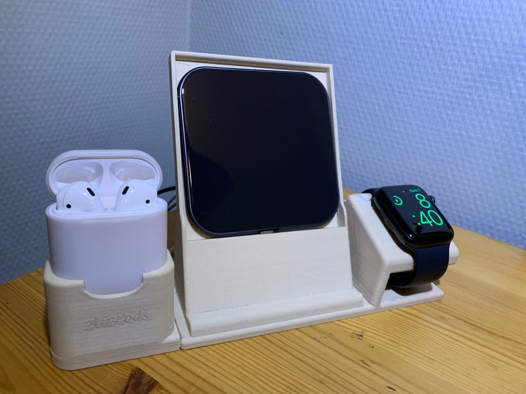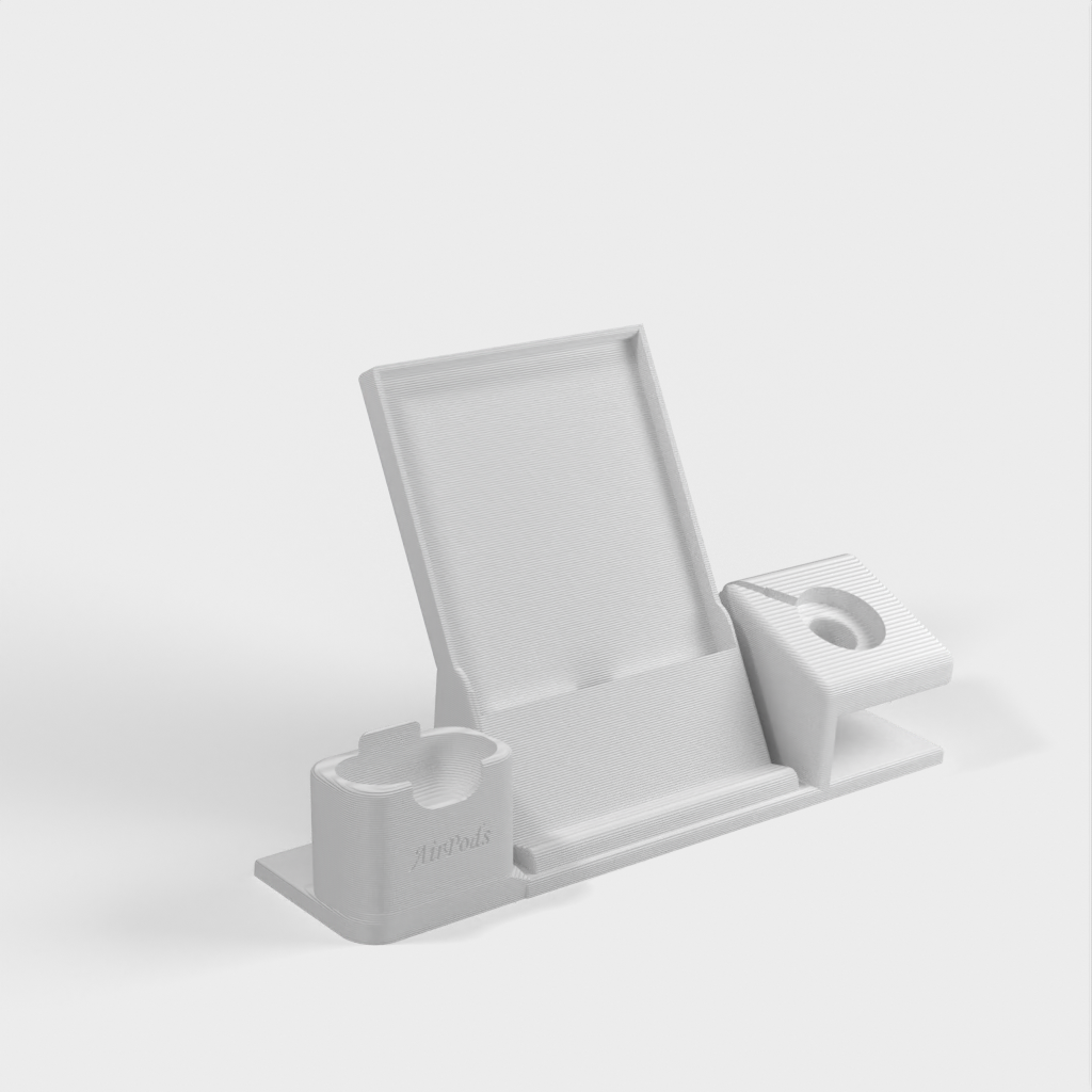 Η βάση για το ρολόι σας επιτρέπει να βλέπετε πάντα την ώρα ενώ το Apple Watch σας φορτίζει και καθιστά δυνατή τη χρήση του ρολογιού ως ξυπνητήρι. Η βάση τηλεφώνου διατηρεί το smartphone σας σε όρθια θέση και η βάση AirPods σας επιτρέπει να φορτίζετε εύκολα τα AirPods σας. Αυτή η βάση έχει σχεδιαστεί για να είναι συμβατή με τους περισσότερους ασύρματους φορτιστές.