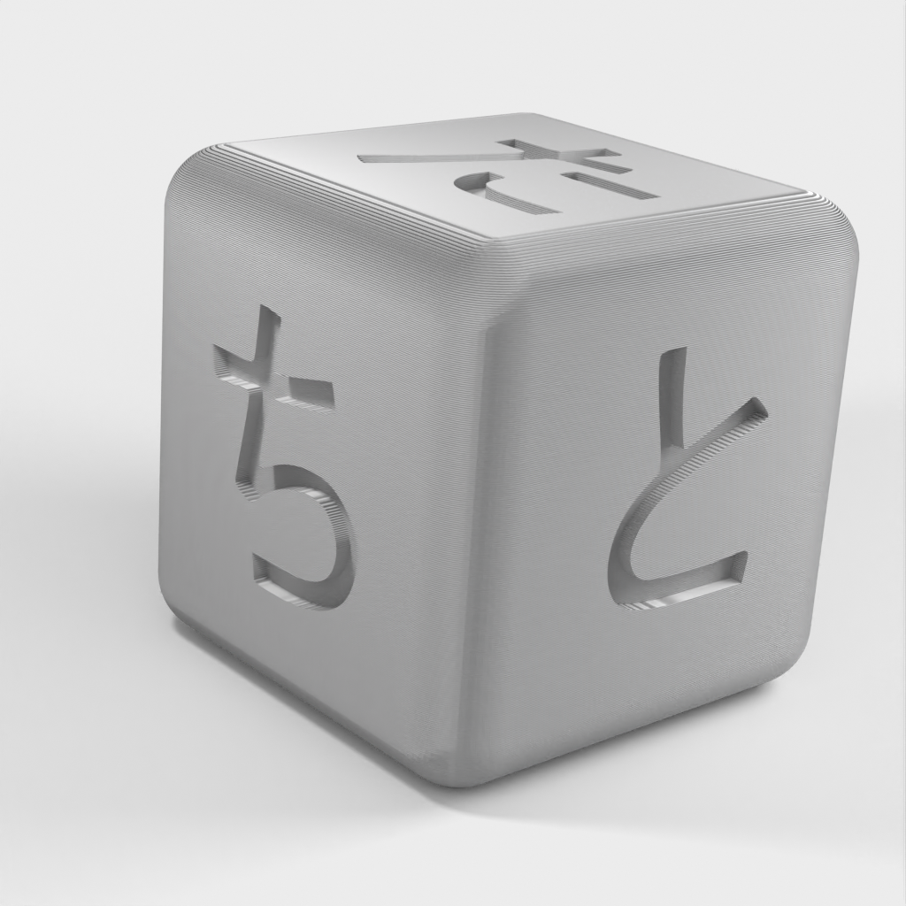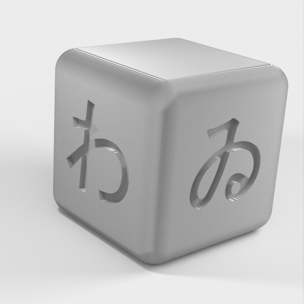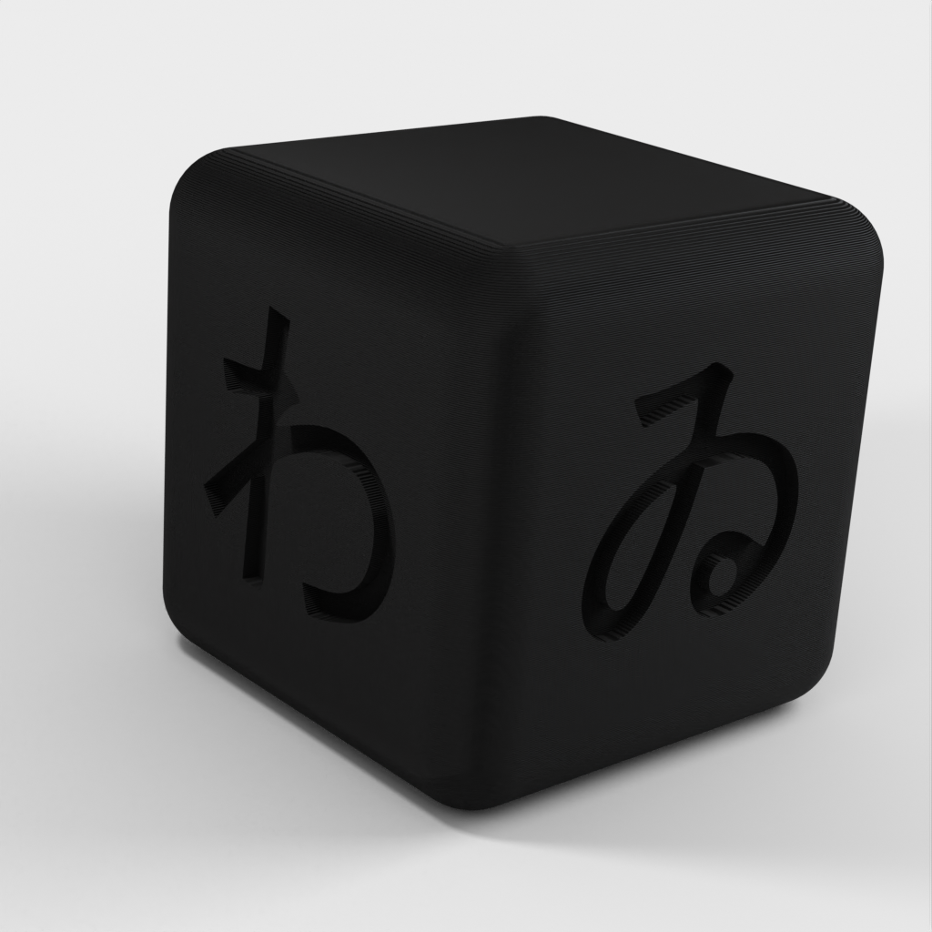 Αυτά είναι τα ζάρια Hiragana, ένα εκπαιδευτικό παιχνίδι που έχει σχεδιαστεί για να βοηθήσει στην εκμάθηση του ιαπωνικού αλφαβήτου, της hiragana. Οι κύβοι έχουν διαστάσεις 2 cm x 2 cm x 2 cm και μπορούν να κλιμακωθούν ανάλογα με τις προτιμήσεις σας. Ιδανικά ως εξάπλευρη κάρτα εκμάθησης, τα περισσότερα έχουν 5 πλευρές με ένα σύμβολο πάνω τους και έναν επίπεδο πάτο. Εκτός από ένα διασκεδαστικό παιχνιδάκι, θα σας βοηθήσει στη βασική κατανόηση της ιαπωνικής γλώσσας.