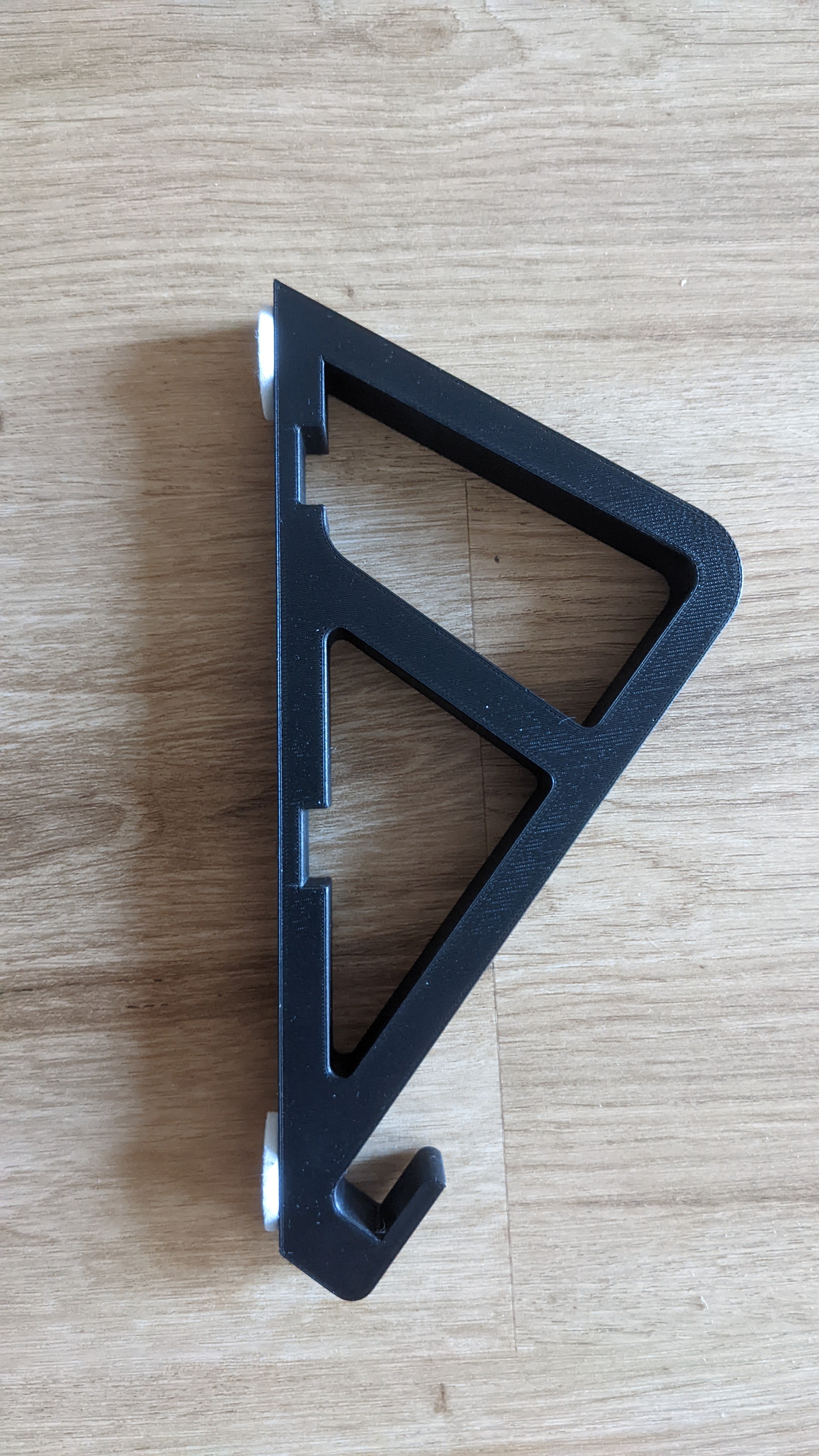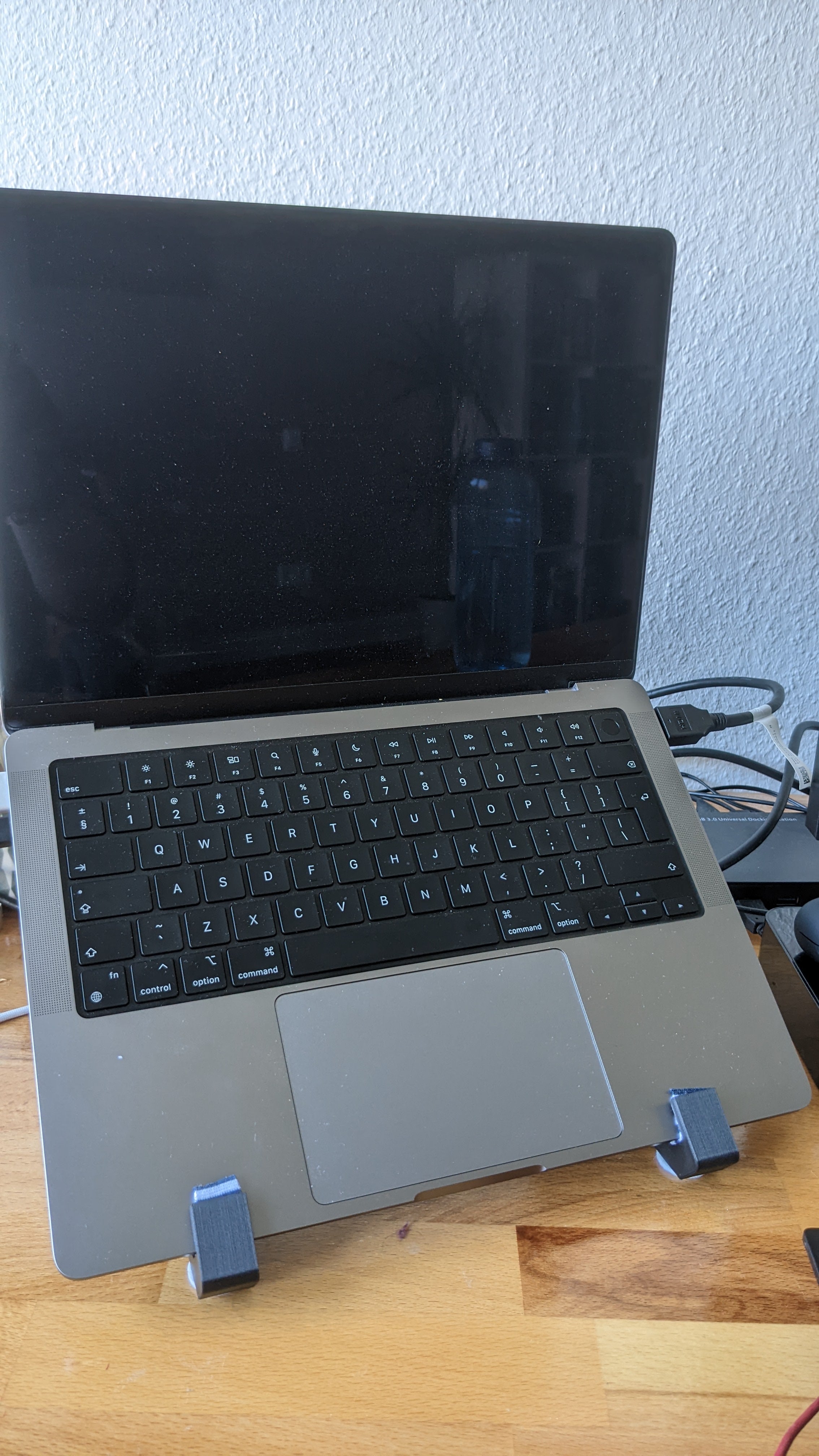 Η βάση Macbook Pro είναι ιδανική για τη φύλαξη του Macbook 14' (2021) ή οποιουδήποτε άλλου φορητού υπολογιστή. Η απόσταση της βάσης μεταξύ των δύο στηριγμάτων είναι 18 cm, οπότε υπάρχει άφθονος χώρος για τα περισσότερα trackpads. Αυτή η βάση περιλαμβάνει 2 υποδοχές και 2 άξονες που κουμπώνουν εύκολα μεταξύ τους. Συνιστούμε να προσθέσετε κάποιο ύφασμα ή κάτι παρόμοιο στα άγκιστρα για να προστατέψετε τους φορητούς υπολογιστές από γρατζουνιές.