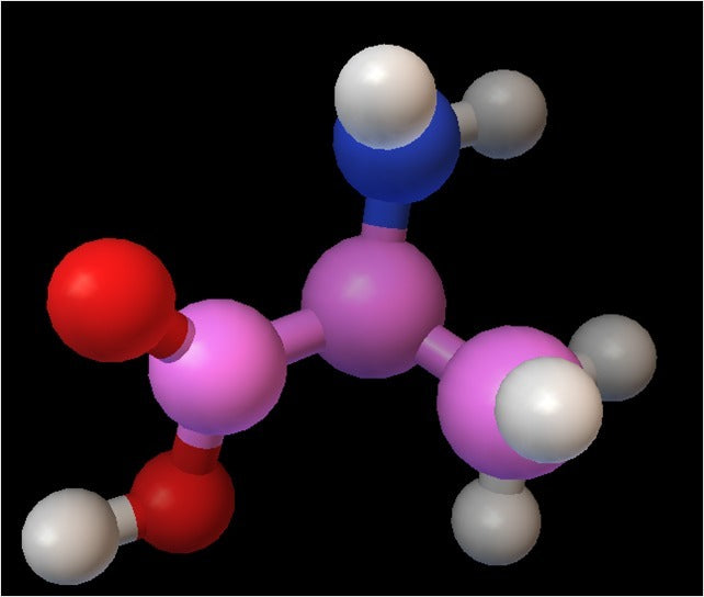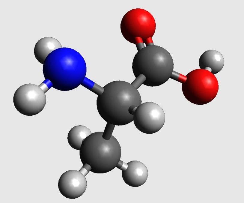 Ένα εξαιρετικά λεπτομερές τρισδιάστατο μοριακό μοντέλο της αλανίνης. Η αλανίνη αποτελεί μέρος πολλών πρωτεϊνών και είναι απαραίτητη για την κατανόηση της διαφοράς μεταξύ γλυκόζης και υδατανθράκων όπως η λακτόζη, απεικονίζοντας γιατί χρειαζόμαστε διαφορετικούς τύπους τροφίμων για να παρέχουμε στον οργανισμό τα απαραίτητα θρεπτικά συστατικά.