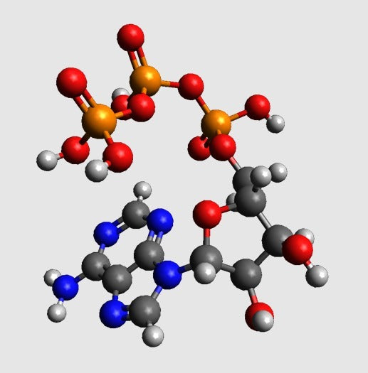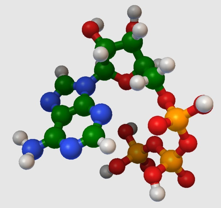 Ένα μοριακό μοντέλο της τριφωσφορικής αδενίνης (ΑΤΡ). Αυτό το μοντέλο χρησιμοποιείται για τη διδασκαλία της χημείας και είναι ιδιαίτερα χρήσιμο για την εξήγηση του συστήματος παροχής ενέργειας του σώματος. Το μοντέλο μπορεί να συγκριθεί με ένα μοντέλο του ADP, το οποίο είναι το ATP μετά την παροχή ενός φωσφορικού άλατος για ενέργεια. Το μοντέλο είναι αδιάβροχο και έχει σχεδιαστεί ώστε να είναι συμβατό με την τρισδιάστατη εκτύπωση.