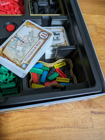 Χρησιμοποιώντας αυτήν την λύση οργάνωσης, ο χώρος στο κουτί παιχνιδιού χρησιμοποιείται με τον καλύτερο τρόπο και τα εξαρτήματα του παιχνιδιού σας διατηρούνται όμορφα μαζί και οργανωμένα. Είναι ένα λειτουργικό κουτί που συμβάλλει στη διατήρηση του παιχνιδιού σας Ticket To Ride τακτοποιημένο και έτοιμο για χρήση, ώστε να μπορείτε να εστιάσετε πλήρως στο δίκτυο διαδρομών και τη στρατηγική.