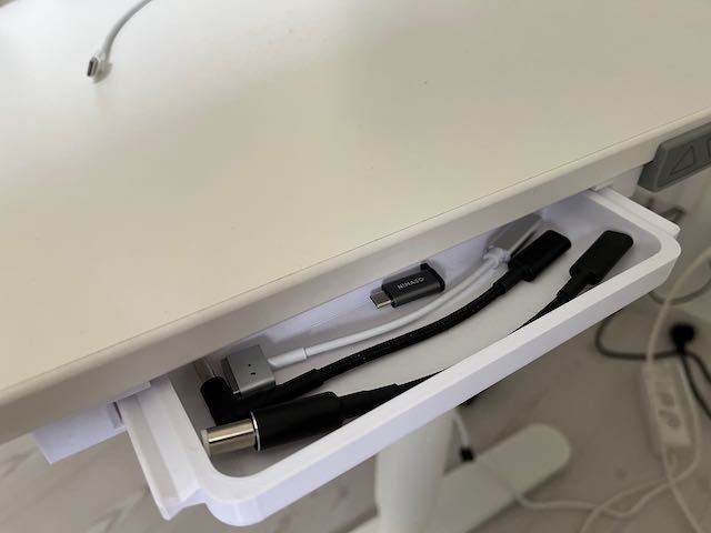 Συρτάρι με συρτάρια για ρυθμιζόμενο ύψος γραφείου "Bekant" από την ΙΚΕΑ. Αυτό το συρτάρι είναι χαμηλότερο σε ύψος και το μήκος προσαρμόζεται στο γραφείο "Bekant". Ιδανικό για τα καλώδια και τους προσαρμογείς USB-C μου.