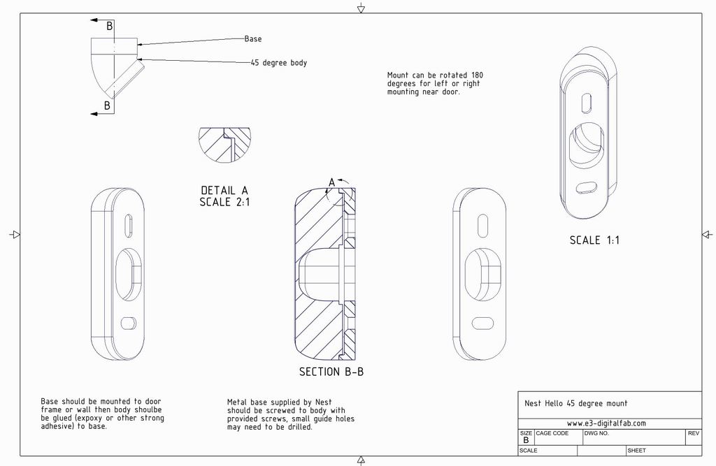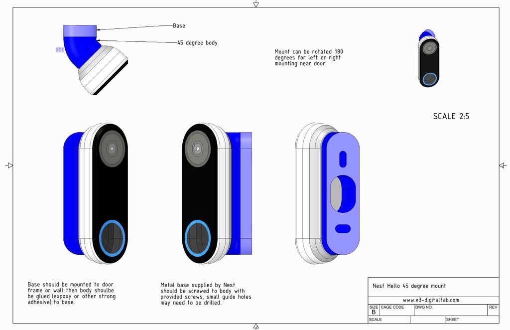 Αυτός ο βραχίονας στήριξης έχει σχεδιαστεί ειδικά για το κουδούνι Google Nest Hello και διασφαλίζει ότι το κουδούνι σας βρίσκεται σε τέλεια γωνία 45 μοιρών. Το σετ αποτελείται από δύο μέρη: μια επίπεδη βάση που μπορεί εύκολα να τοποθετηθεί σε έναν τοίχο ή ένα πλαίσιο πόρτας με βίδες και έναν προσαρμογέα 45 μοιρών που ευθυγραμμίζεται με τη βάση και συγκρατεί το κουδούνι στη βέλτιστη θέση.