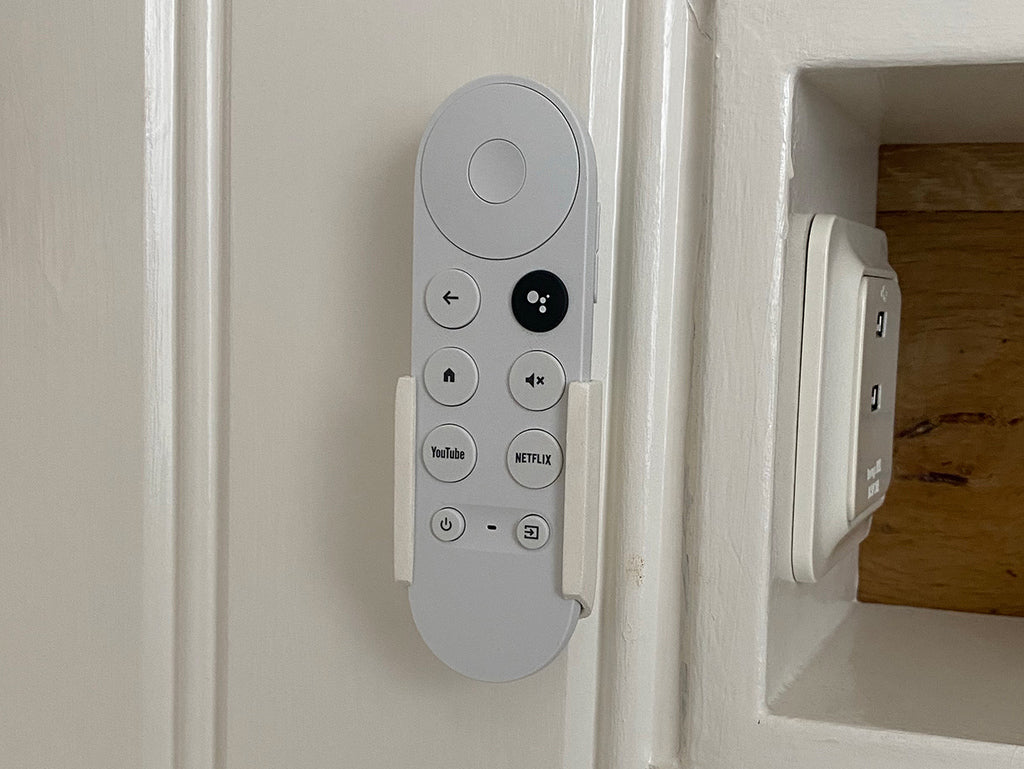 Θήκη για τηλεχειριστήριο Chromecast με Google TV. Εισάγετε το τηλεχειριστήριο σύροντάς το από πάνω. Το κάτω μέρος είναι φαρδύτερο για να μην γλιστρήσει. Αυτό καθιστά εύκολη την εισαγωγή και αφαίρεση του τηλεχειριστηρίου. Η βάση έχει σχεδιαστεί για να τοποθετείται στον τοίχο με βίδες ή ταινία διπλής όψης 3M για μια στιβαρή και ασφαλή τοποθέτηση.