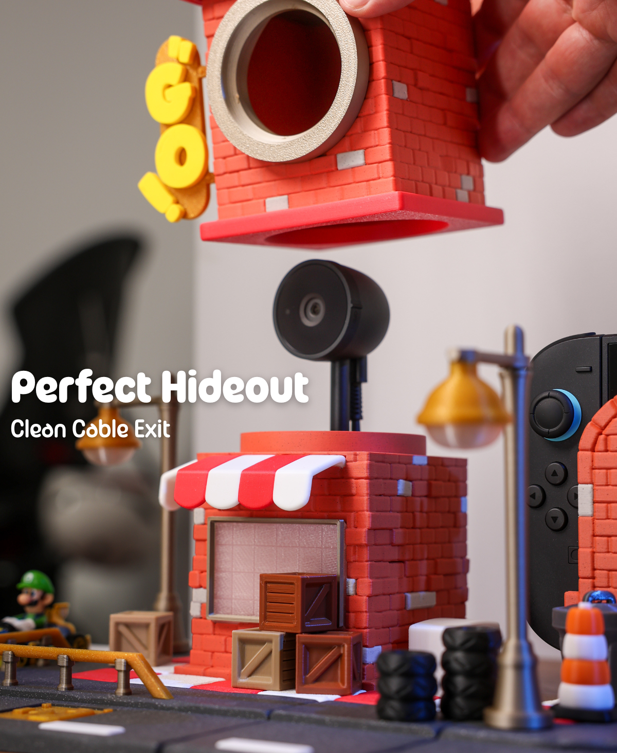 Αυτός ο Πύργος Κάμερας, μέρος της συλλογής Turbo District, ασφαλίζει την Κάμερα του Nintendo Switch 2 σας. Μπορείτε εύκολα να ενεργοποιήσετε τη λειτουργία απορρήτου περιστρέφοντας τον δεύτερο όροφο του πύργου και κρύβοντας την κάμερα. Διαθέτει διακριτική διαχείριση καλωδίων και μια επάνω πλατφόρμα, ιδανική για την προβολή ενός φιγούρας amiibo στη ρύθμιση του παιχνιδιού σας.