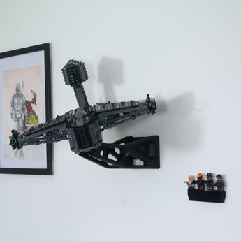 Αυτή η βάση στήριξης τοίχου είναι σχεδιασμένη για το σετ LEGO Star Wars The Justifier 75323. Επιτρέπει την προβολή του μοντέλου στραμμένου προς τα αριστερά, δεξιά ή υπό γωνία, ενώ παράλληλα διευκολύνει την απομάκρυνση του σετ. Περιλαμβάνεται μια ξεχωριστή βάση για μίνι φιγούρες και η τοποθέτηση απαιτεί μόνο μία βίδα στον τοίχο.