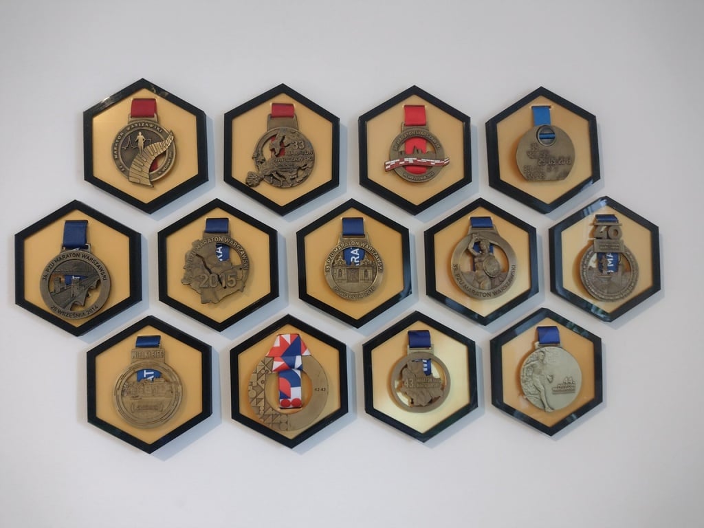 Αυτή είναι μια διμερής (δίχρωμη) εξαγωνική θήκη/πλαίσιο μετάλλων για να εκθέσετε τα μετάλλιά σας τακτοποιημένα στον τοίχο. Χάρη στο εξαγωνικό σχήμα, τα μετάλλια μπορούν να τοποθετηθούν με συμμετρικό και ωραίο τρόπο.