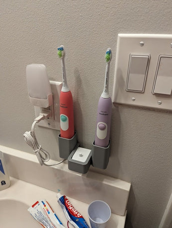 Αυτή η λειτουργική βάση έχει σχεδιαστεί για να οργανώνει αποτελεσματικά τις οδοντόβουρτσες και τον φορτιστή Philips Sonicare. Παρέχει χώρο για δύο οδοντόβουρτσες καθώς και έναν ειδικό χώρο για τον φορτιστή σας στη μέση. Το άνοιγμα του φορτιστή εξασφαλίζει σταθερό κράτημα χωρίς κίνηση, ώστε ο φορτιστής σας να είναι πάντα σταθερά τοποθετημένος. Μια έξυπνη εσοχή στο πίσω μέρος επιτρέπει στο καλώδιο να απομακρυνθεί διακριτικά, γεγονός που συμβάλλει σε ένα τακτοποιημένο μπάνιο. Με εσωτερικές διαστάσεις 32,5 mm x 32,5 mm, η θήκη ταιριάζει σε μια μεγάλη γκάμα μοντέλων Philips Sonicare, συμπεριλαμβανομένων των HX6250 και HX686W, καθιστώντας την μια ευέλικτη επιλογή για τα αξεσουάρ Philips. Μπορείτε να επιλέξετε να τοποθετήσετε τη βάση στον τοίχο με ταινίες διπλής όψης για να εξοικονομήσετε χώρο ή απλά να την τοποθετήσετε σταθερά σε έναν πάγκο, καθώς έχει επίπεδη και ισορροπημένη βάση. Αυτή η λύση βοηθά να διατηρείτε τους φορτιστές και τις οδοντόβουρτσες Philips Sonicare συγκεντρωμένους και εύκολα προσβάσιμους.